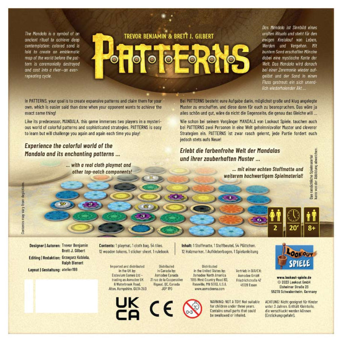 PATTERNS - A Mandala Game draws you in as you take turns swapping tiles from the large mandala spread at your lovely tea towel. Each player tries to mark contiguous colored areas as territory. Your opponent will try to cross your paths and both of you will have to choose wisely where to put your scoring markers. And of course - whoever stays calm enough to score the most points wins. Which is absolutely fine, because PATTERNS - A Mandala Game is not only explained in less than 5 minutes, it's also quickly set up again and this you delve right into revenge...