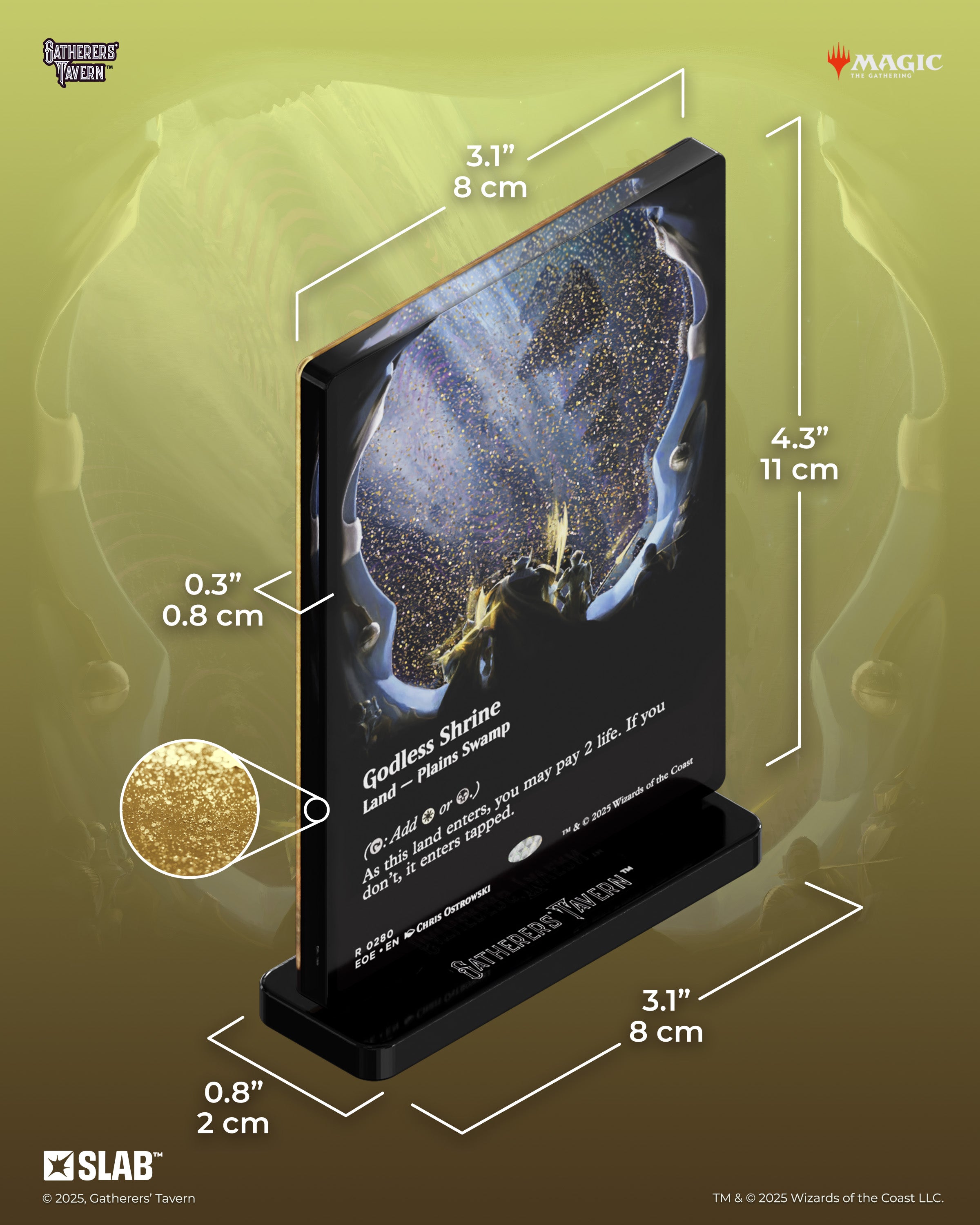 Two faiths of darkness and light circle each other in opposition over a dying star. Featuring Chris Ostrowski's Borderless Viewport art for Edge of Eternities, prepare for an intergalactic confrontation with this Godless Shrine Slab standee.