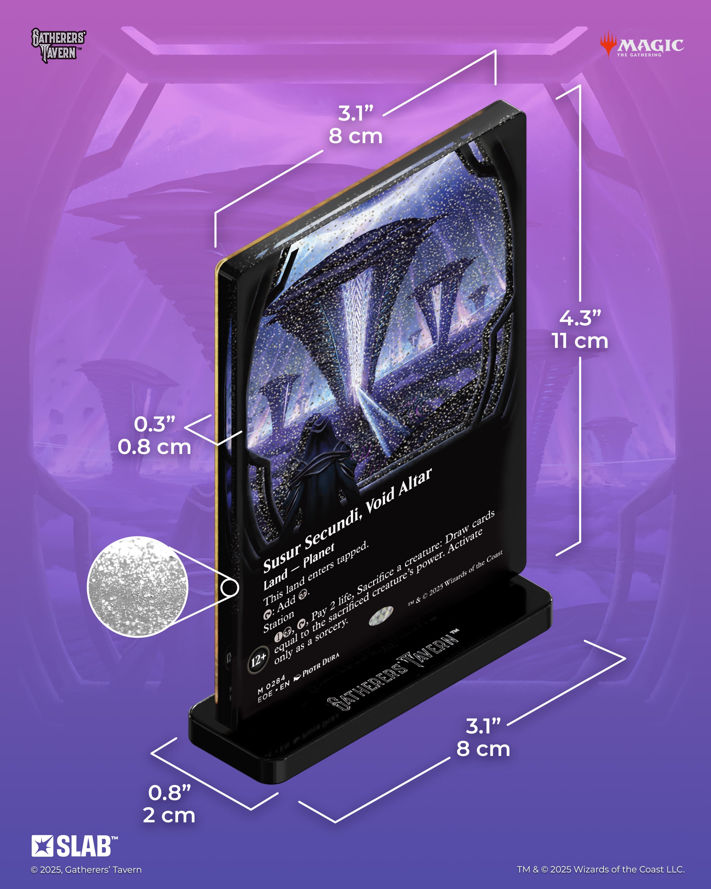 This sun-blackened world, pinched and pulled towards Sothera, is a gift and a sign. Featuring Piotr Dura's Borderless Viewport art for Edge of Eternities, make the pilgrimage to Susur Secundi, Void Altar to welcome the thousandth supervoid with this dark Slab standee.