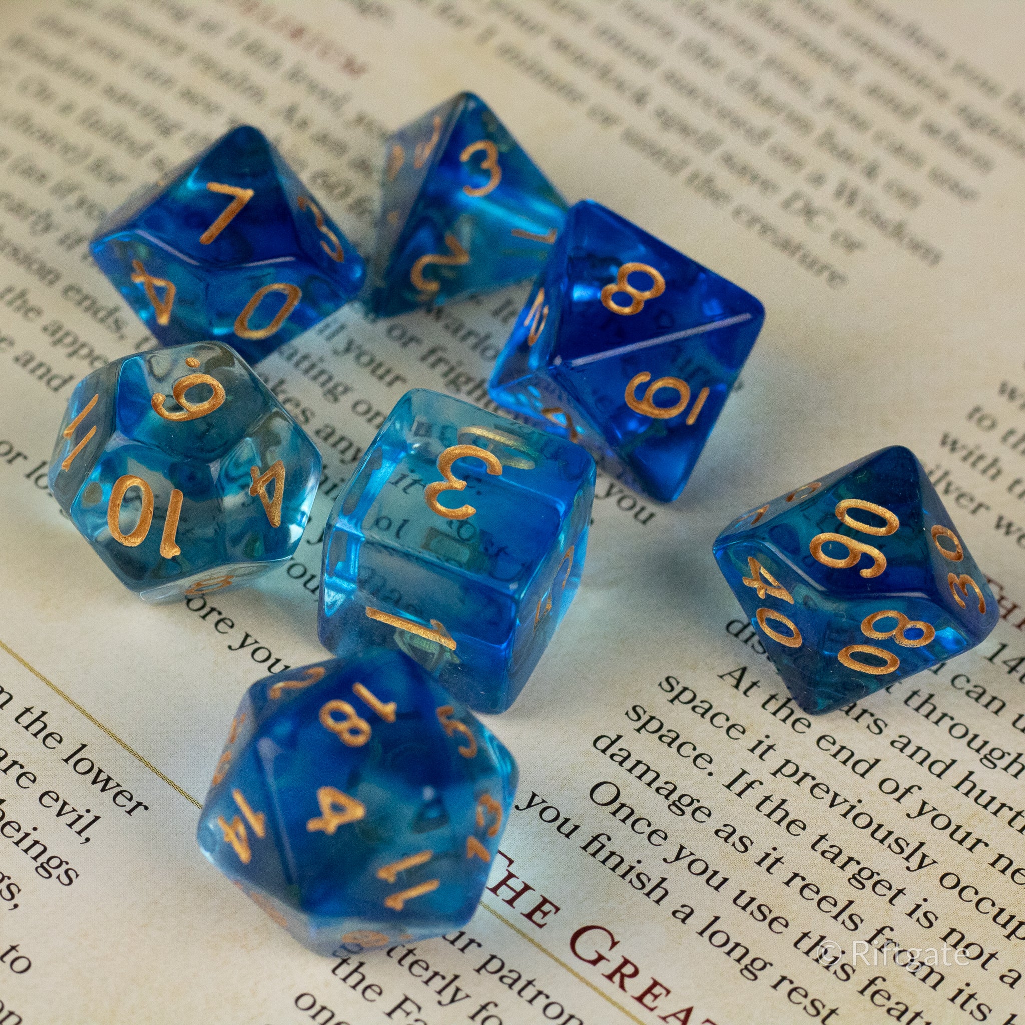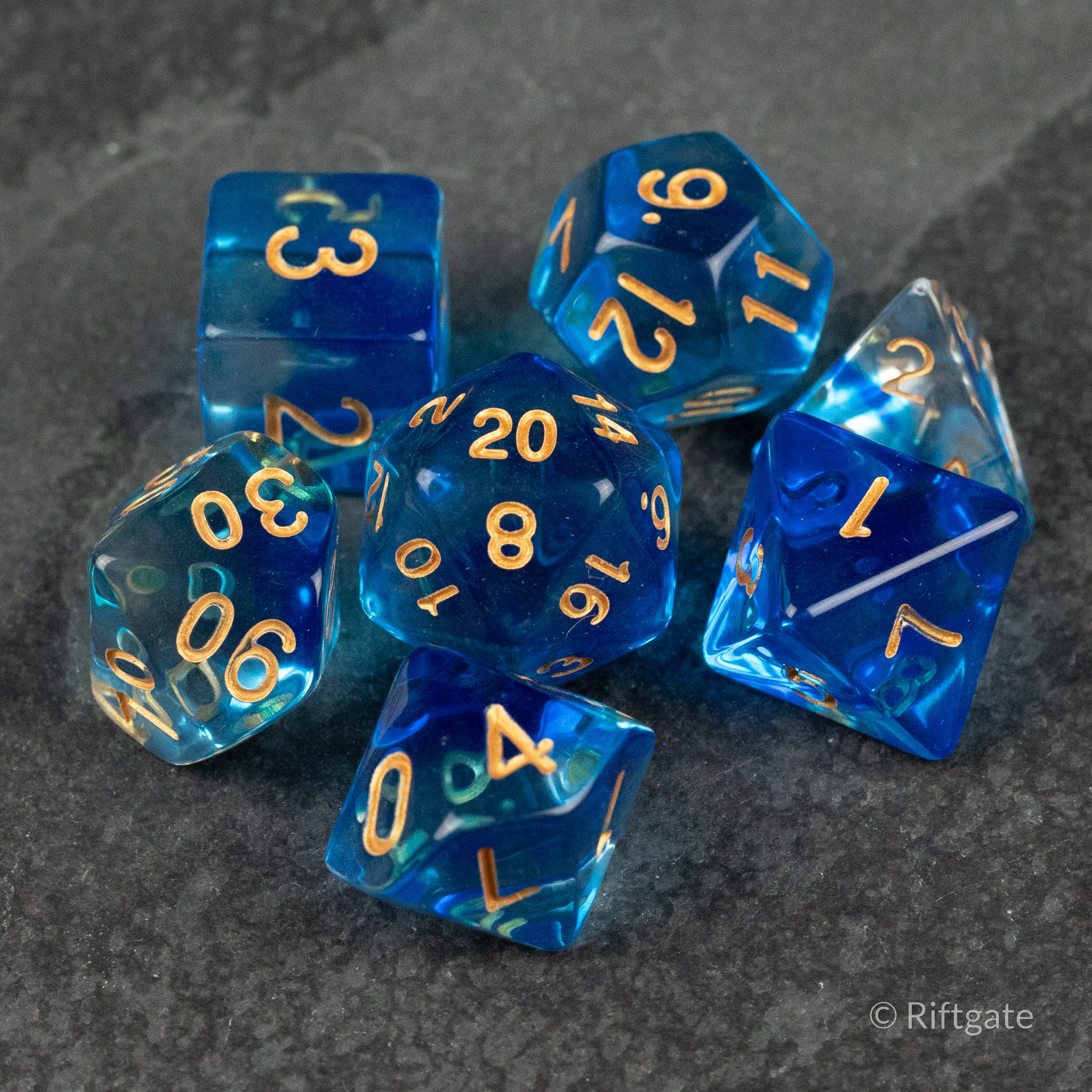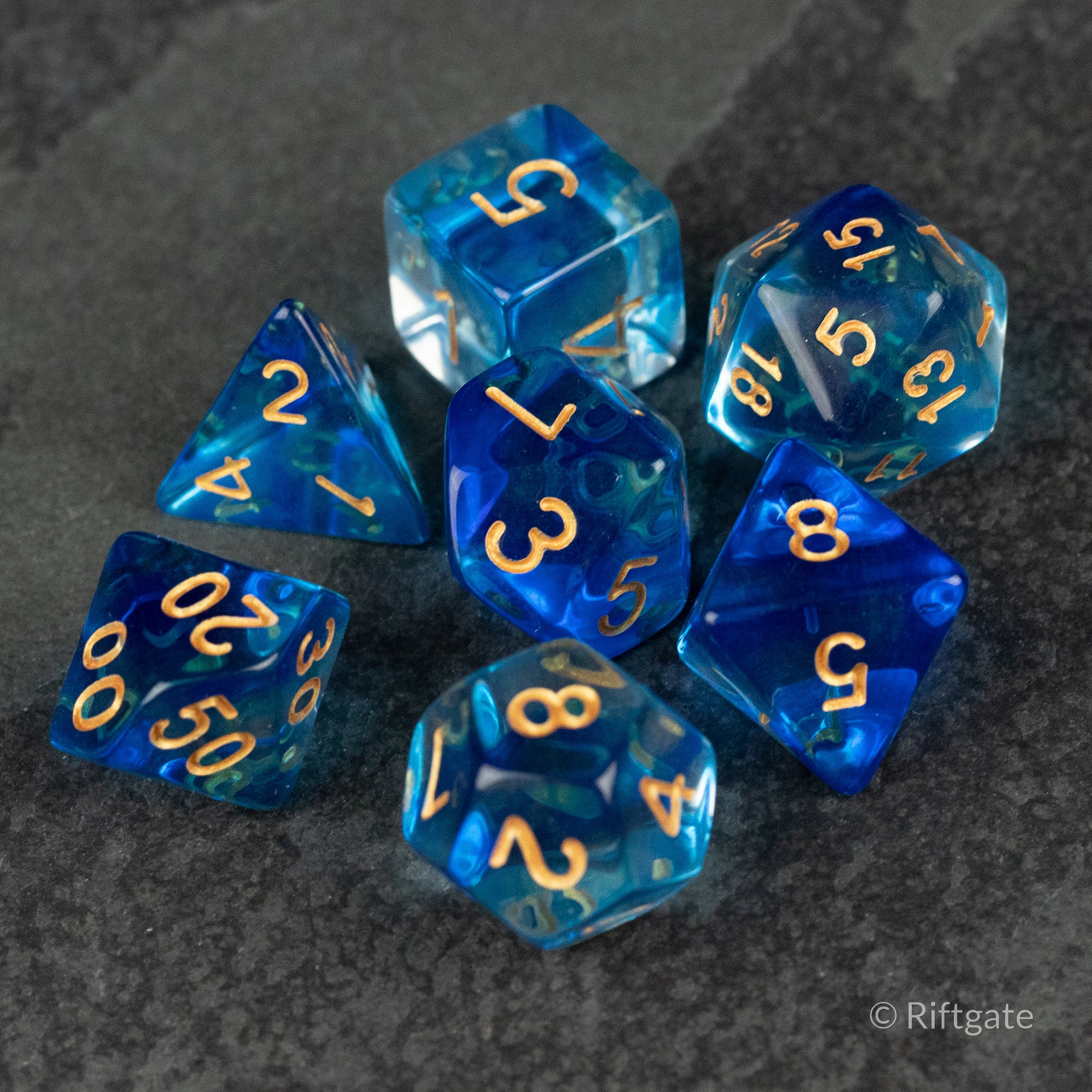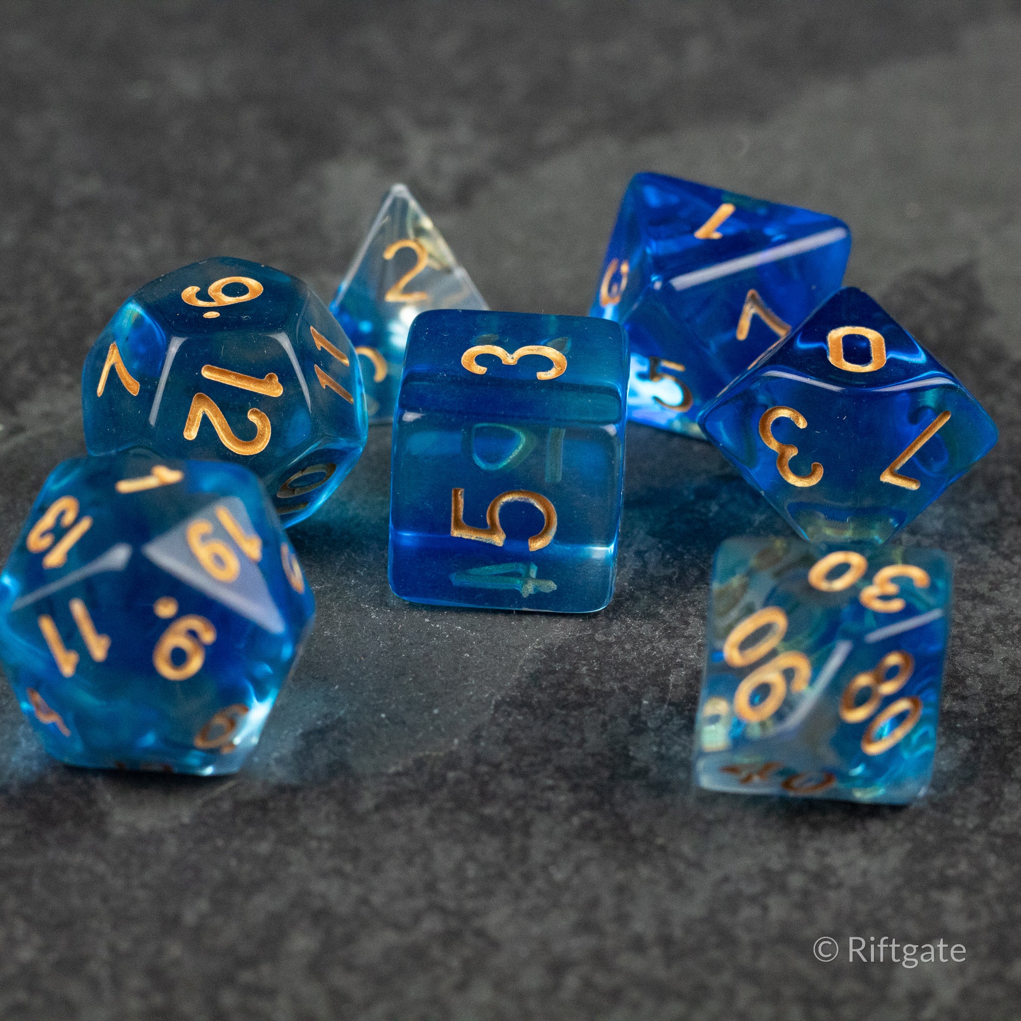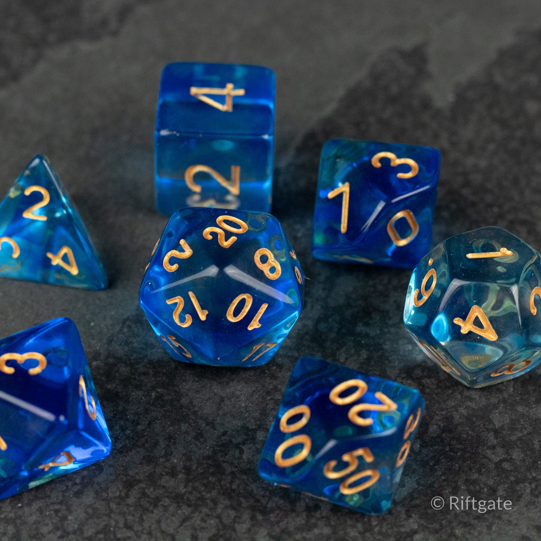 Enhancing the allure of these dice are the opulent gold ink engravings, ensuring that your rolls are not only precise but also a delight to behold. The shimmering gold accents harmonize beautifully with the cool blue hues, offering a touch of regal elegance to your gaming sessions.