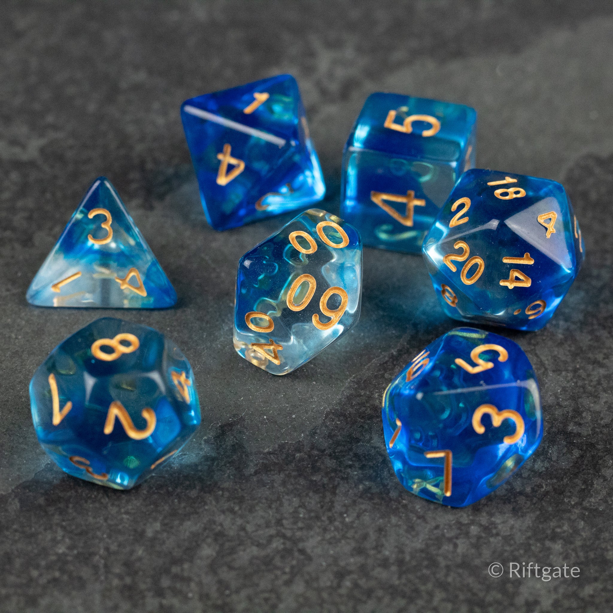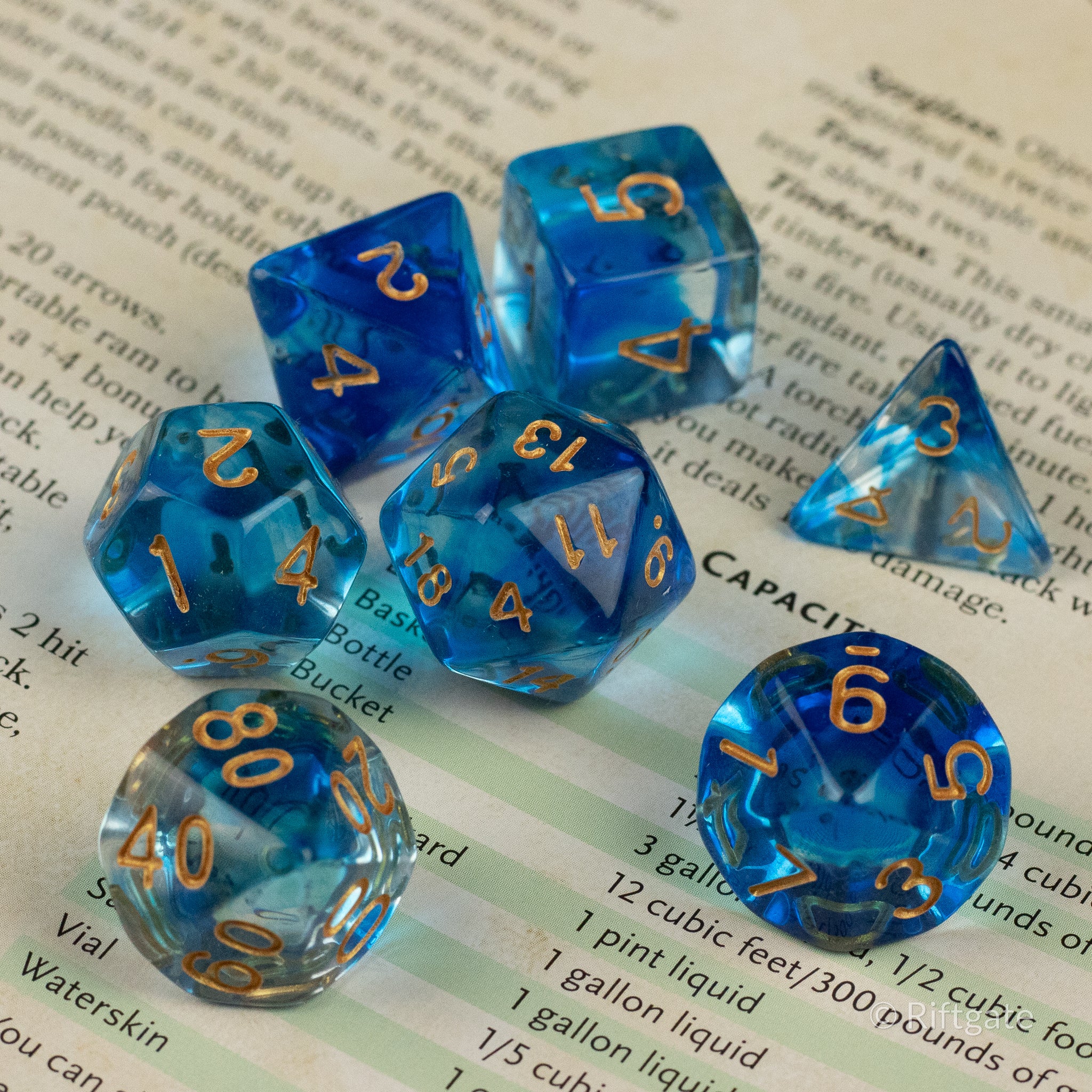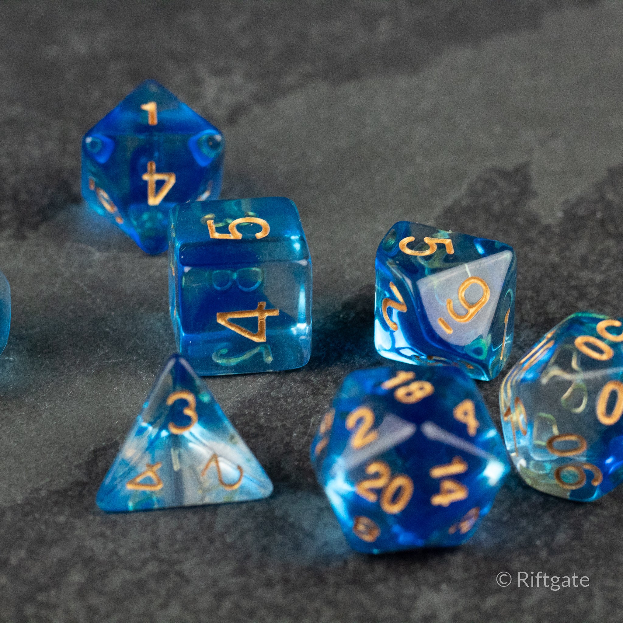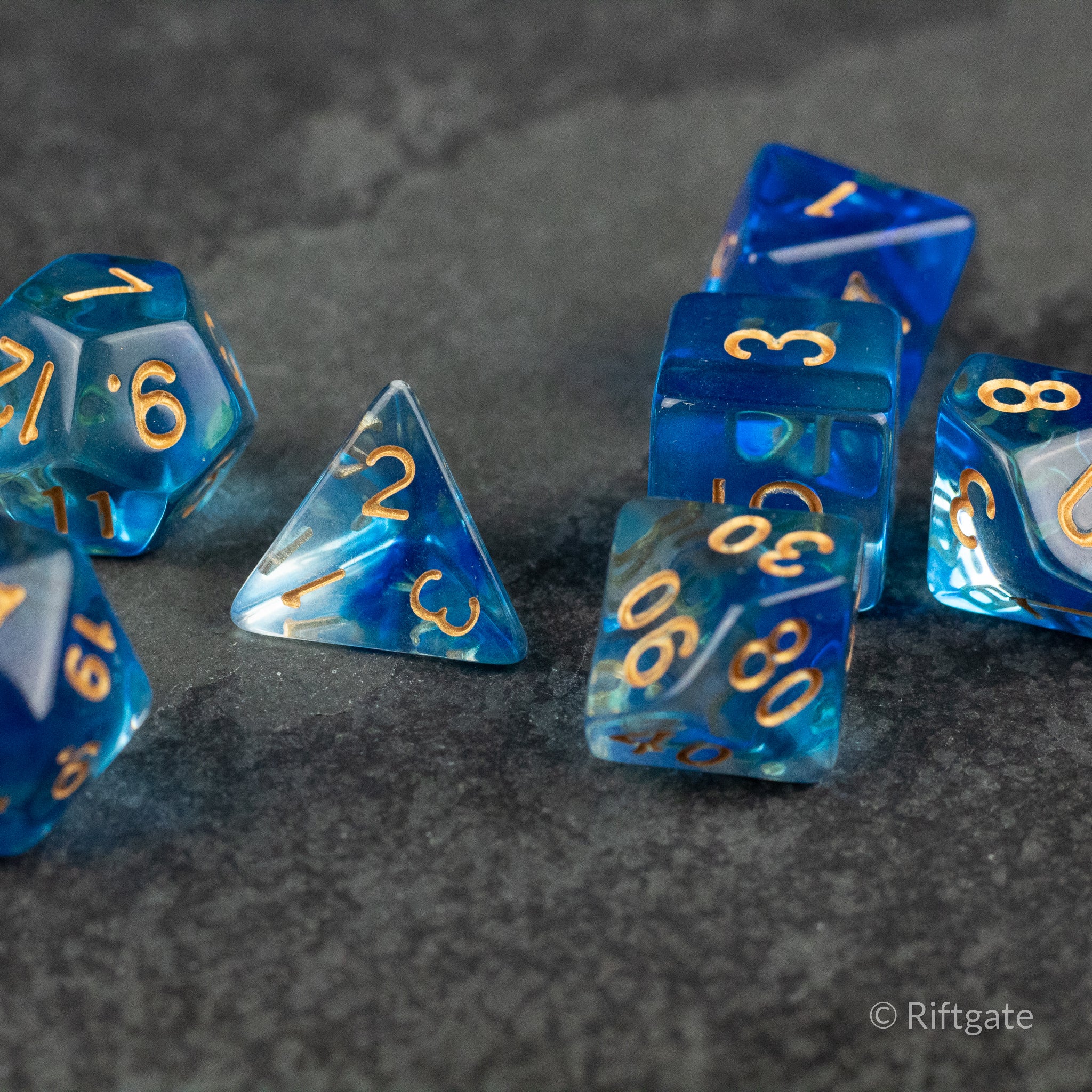 Each die in this set is crafted with a mesmerizing blue vapor design that seems to swirl with every roll. The Ethereal Mist design creates a sense of mystery and enchantment, making these dice the perfect choice for those who seek a touch of magic in their gaming.