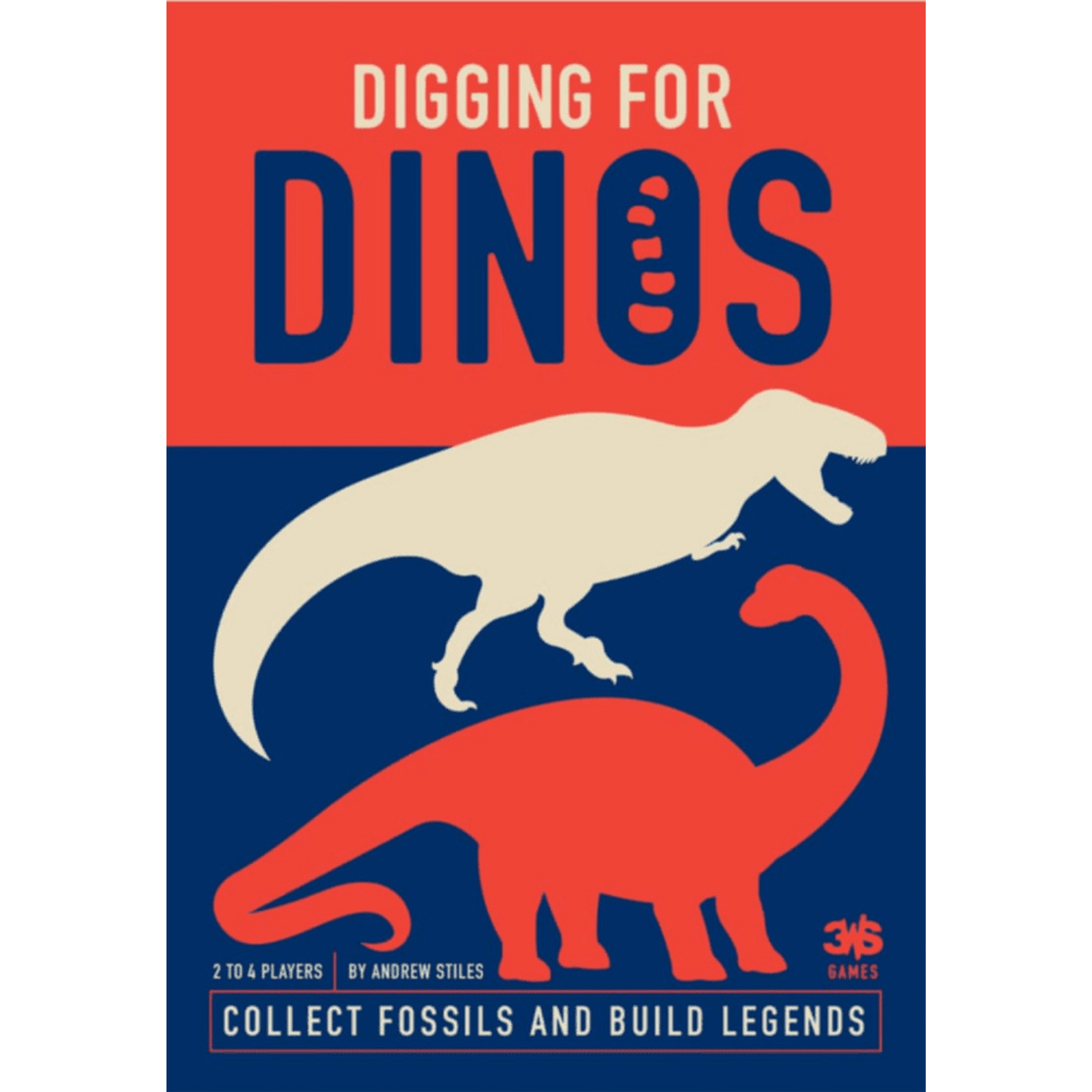 Grab your gear and your maps, and get ready to collect dinosaur fossils in Digging for Dinos! Players control 2 archaeologists, with unique movement (diagonal and orthogonal). Each turn players move one archaeologist to a new dig site, collecting a fossil from the dig site that they moved from. Each dig site card contains a piece of a dinosaur fossil. Some dinosaurs require as few as 2 fossils to be completed, while other require many more. Collect all the fossils needed to complete a specific dinosaur to score more points at the end of the game.