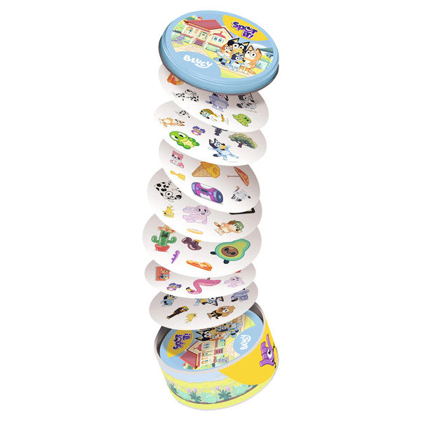 SPOT THE MATCH WITH BLUEY!: Race to find the one matching symbol between any two cards in this fast-paced observation game featuring Bluey & friends.