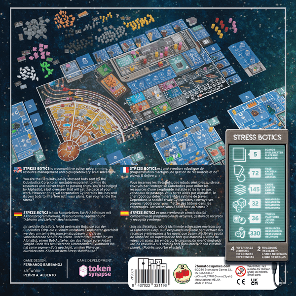Stress Botics is a sci-fi adventure in which four easily-stressable robots (known as Beta Bots) are sent to an exoplanet by their corporation Cubebotics CORP®, in order to mine its resources. Once those resources are extracted, the Beta Bots' task is to deliver them to the corporation's ships. But beware, the environment is constantly adapting - each corporation ship requires different resources delivered at precise orbital entry points. And last, but not least, the rival corporation Cylindroids INC® has sent its own bots to snatch resources and interfere with your bots.