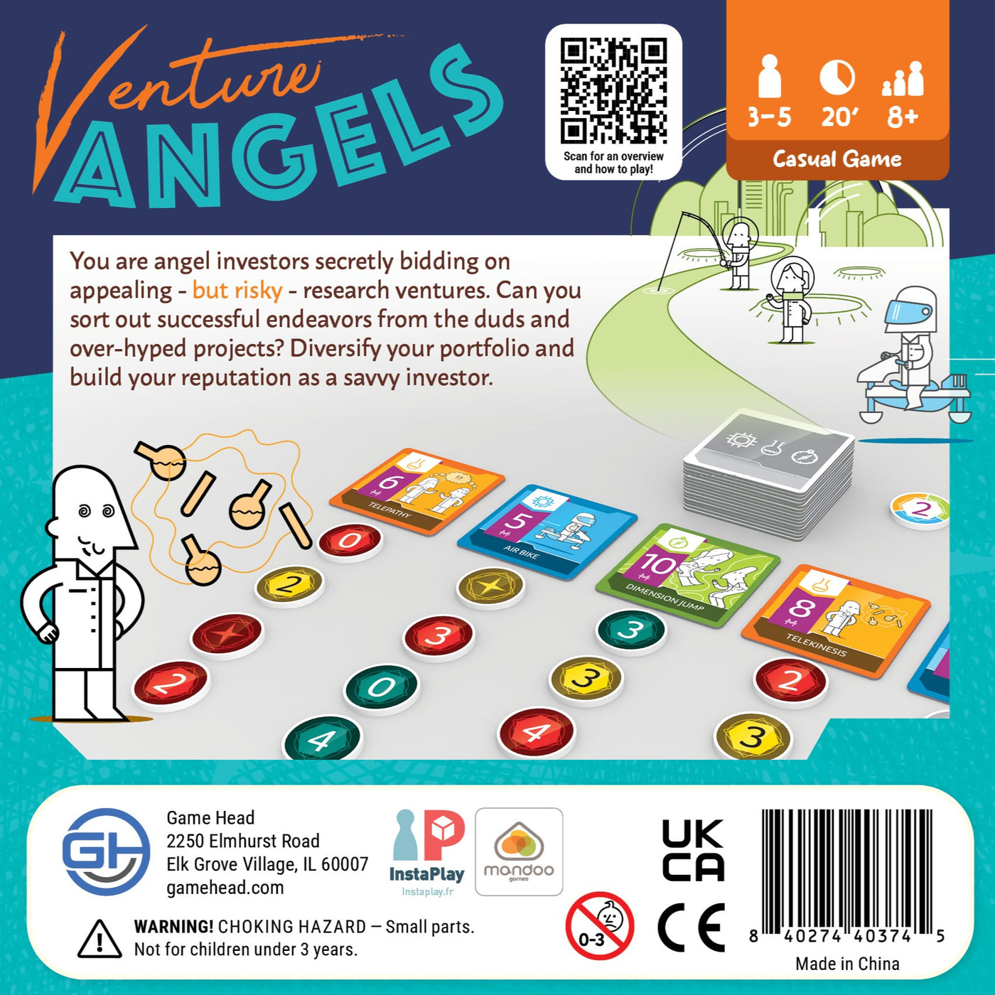 In each round, appealing but risky ventures rise. Sort out pessimistic or frothy ventures from the good ones and invest in them secretly. At the end of each round, reveal the secret biddings and see which ventures have earned enough investment. Investors who made the most noticeable investment in them will be rewarded for their contributions to its success. The investor with the most fame at the end of the game becomes the Venture Angel.