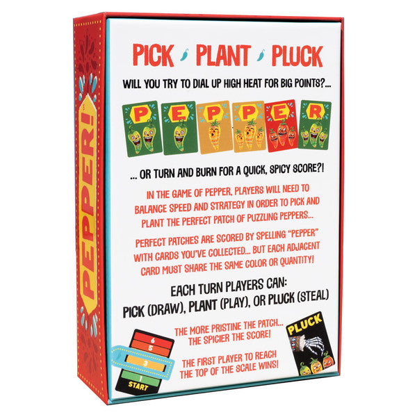 Spell "PEPPER" with cards you've collected...but each adjacent card must share the same color or quantity! The first player to reach the top of the scale wins!