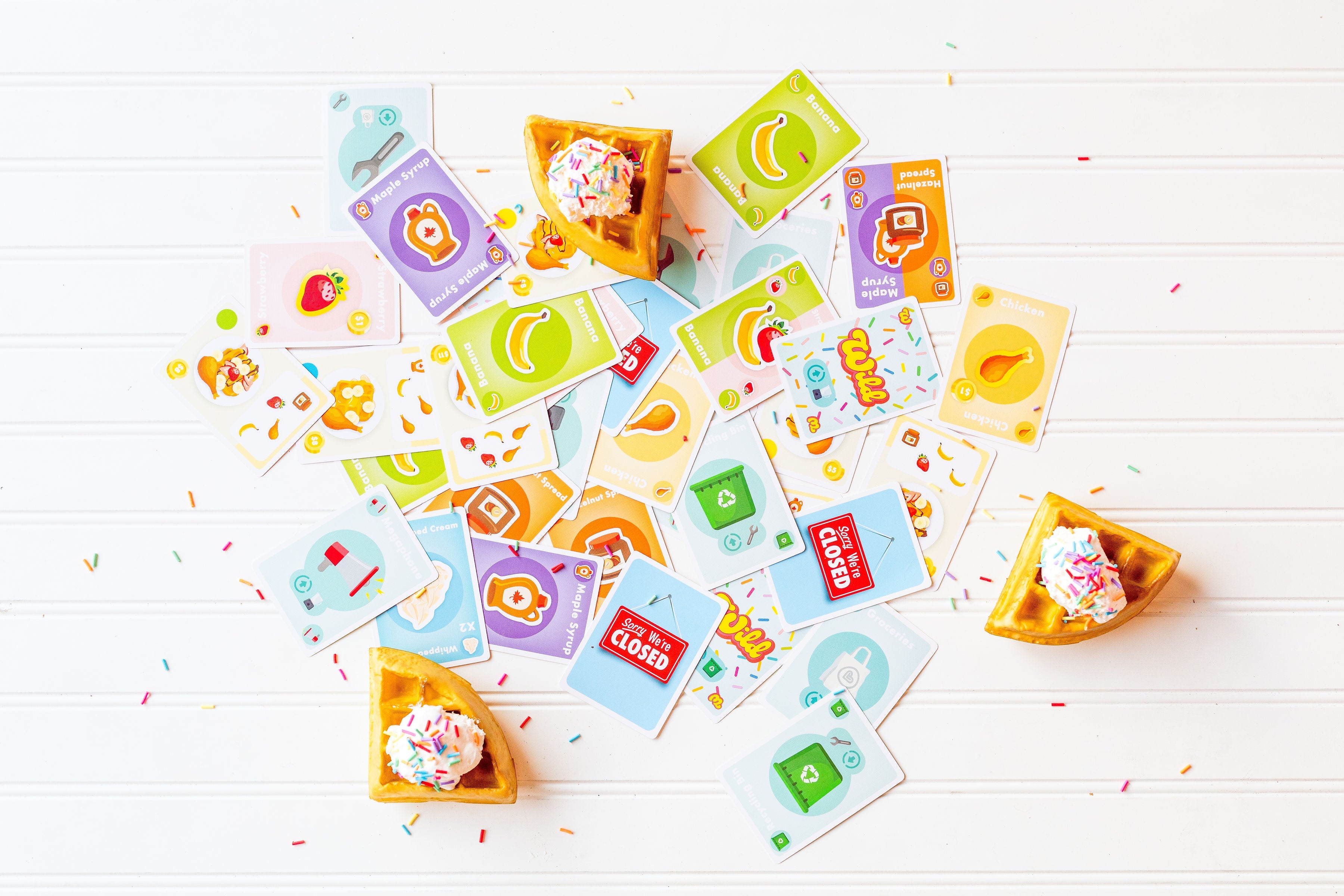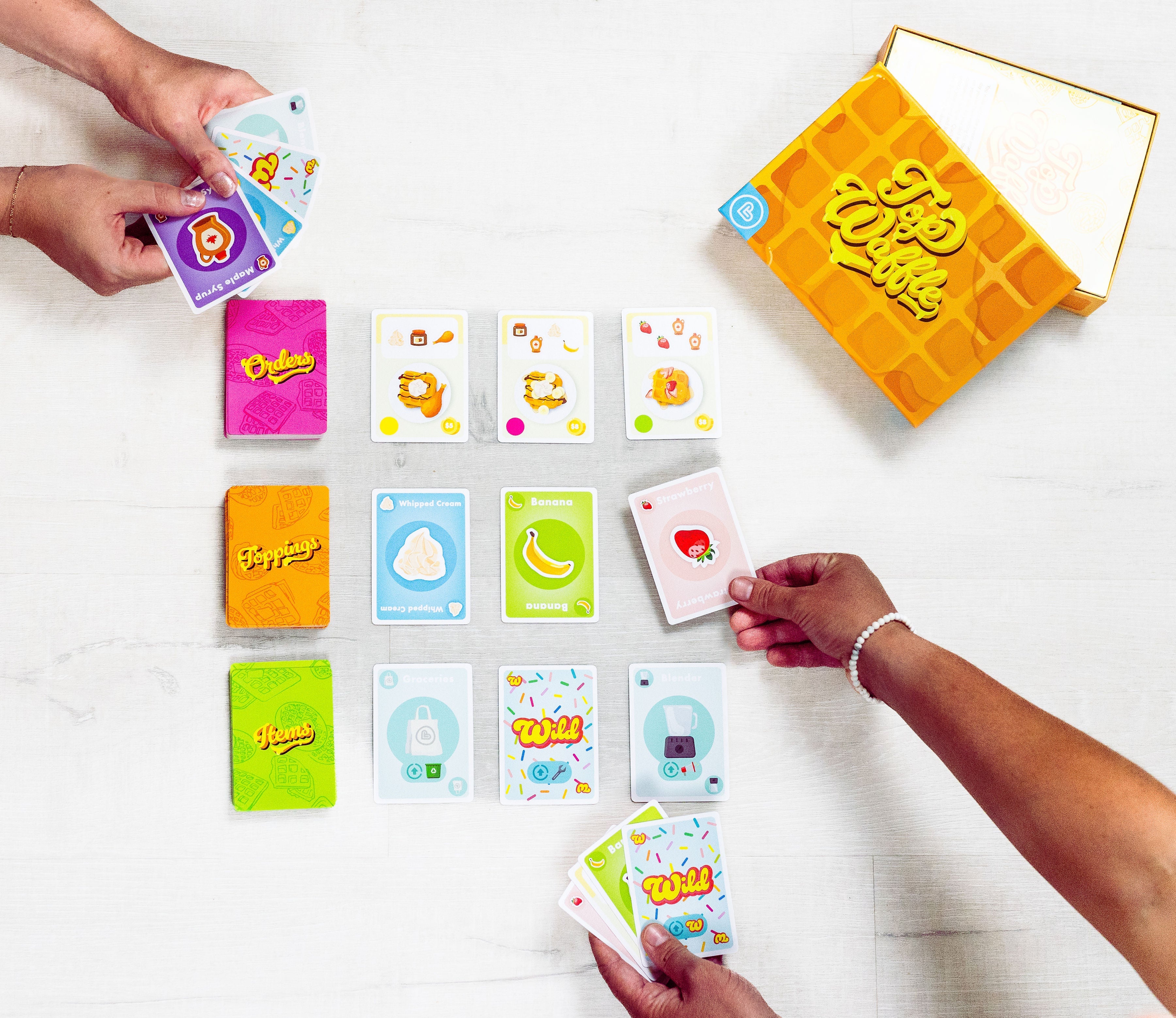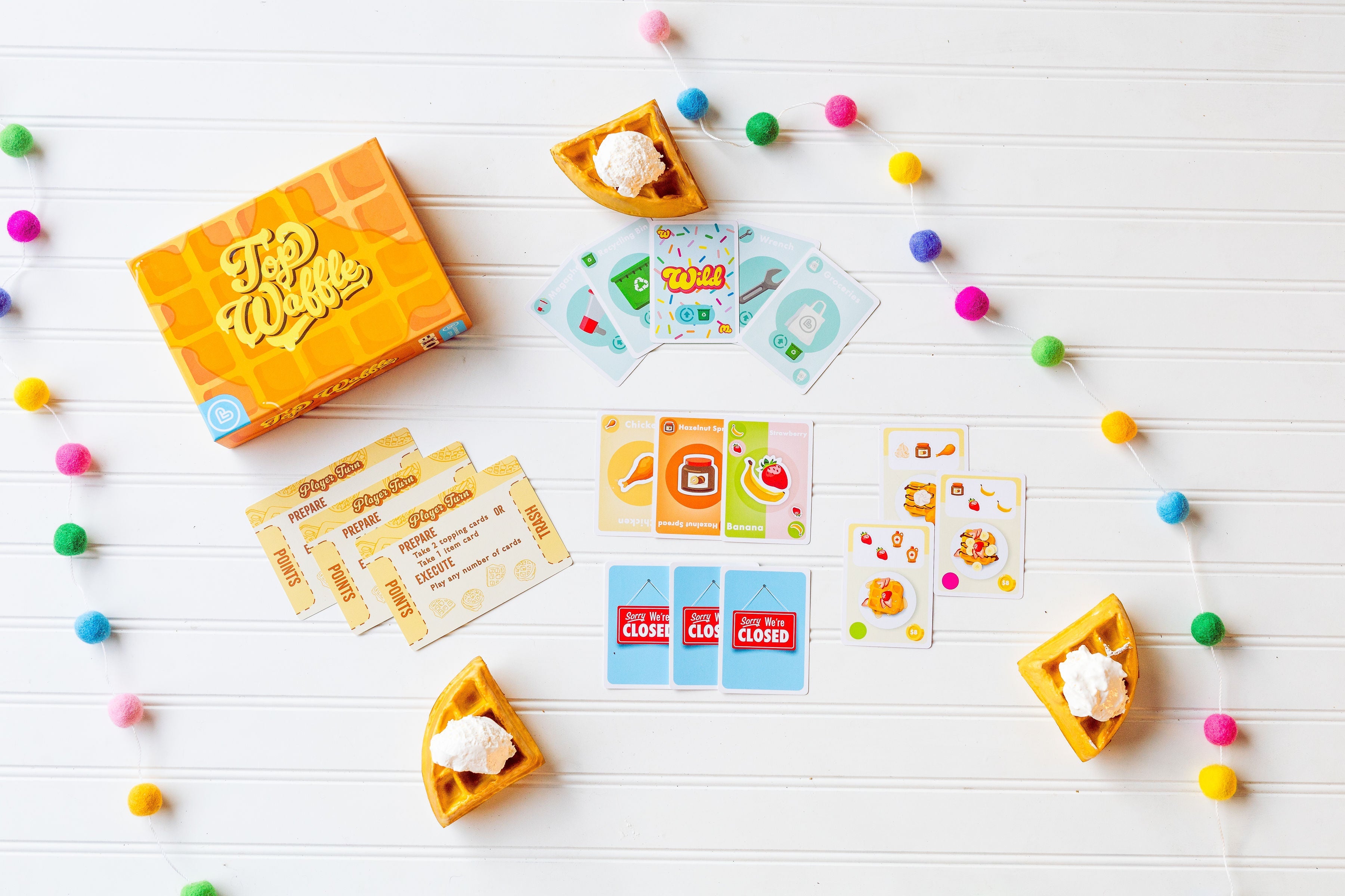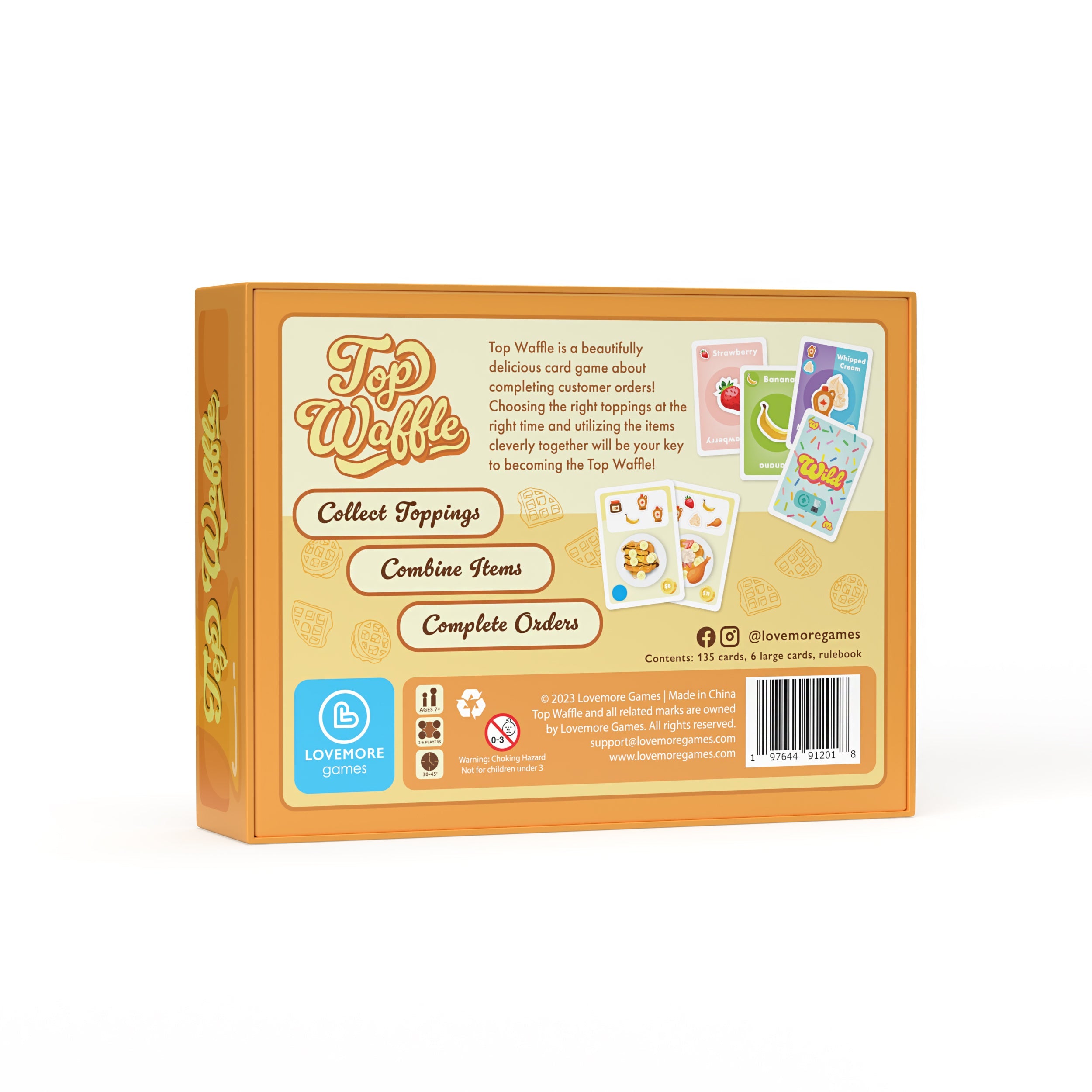 Top Waffle is a beautifully delicious card game about completing customer orders! In this game, 2-6 players will be collecting topping cards and combining unique items to serve more customers than their fellow waffle connoisseurs. After a certain number of customers have been served, the day will end and any leftover toppings in hand will go bad. The game lasts 3 days, and the player with the most points after those 3 days wins and becomes and the Top Waffle!