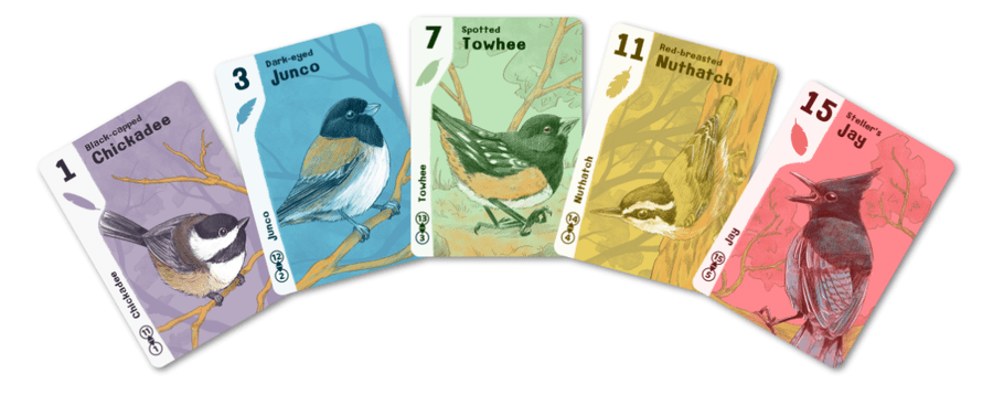 Trickadee is a trick-taking game about spotting the cool birds that visit your backyard feeder. Create flocks each round by collecting birds from every trick— win or lose. Use unique actions to cleverly build your flocks and win the title of best birder on the block. The player with the most points after three rounds wins the game.