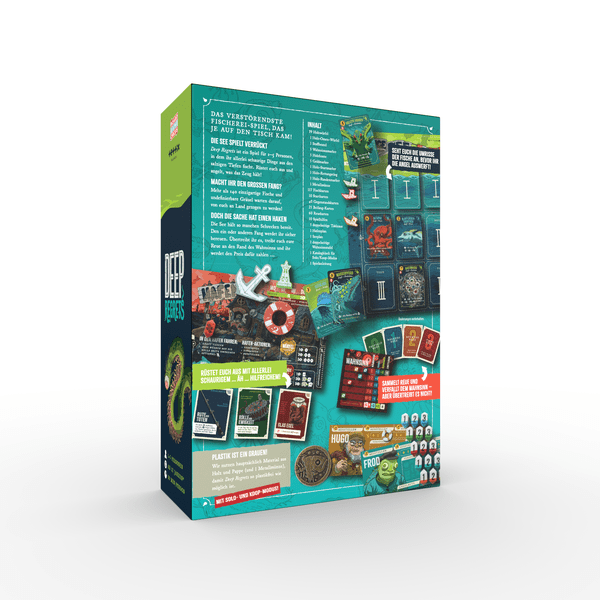 In Deep Regrets, you'll spend a week moving between sea and port, trying to pull in the most desirable creel of fish and fish-adjacent creatures. You'll need to manage your energy, resources and regrets and push your luck to pull in the best haul possible. At the end of the game, you'll score the fish you have in hand, the fish you've mounted, and any Fishbucks you have remaining... and the player with the most regrets will lose their most valuable fish.