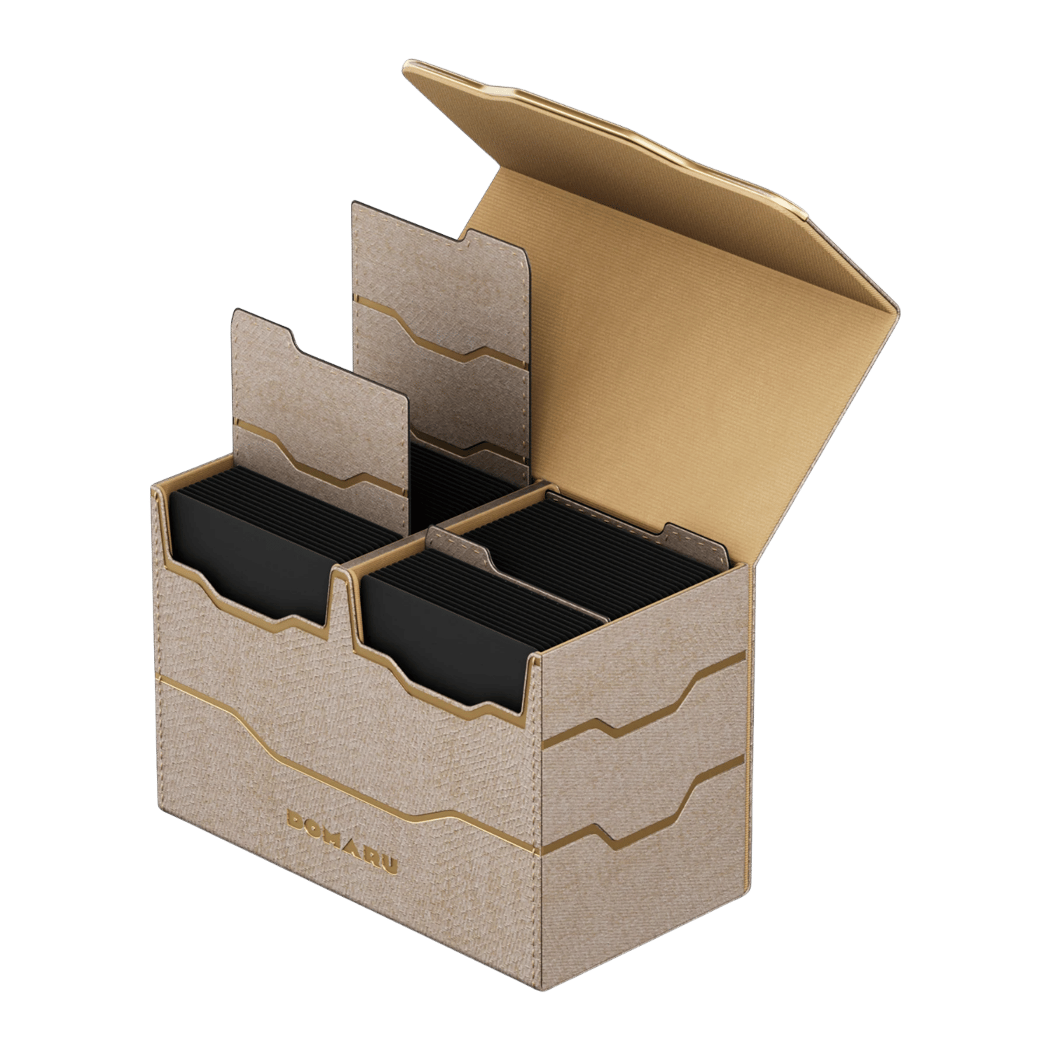 The DOMARU Armory Collection is our latest deck box line, built for strength, durability, and a commanding presence at the table. Featuring refined metallic details, a rugged textured exterior, and strong magnetic closures, each Armory box delivers uncompromising protection for serious play. Top Loading. Fits 200 double-sleeved cards. Includes 2 leather dividers. Strong Magnets. Sturdy textured leather materials and metallic details.