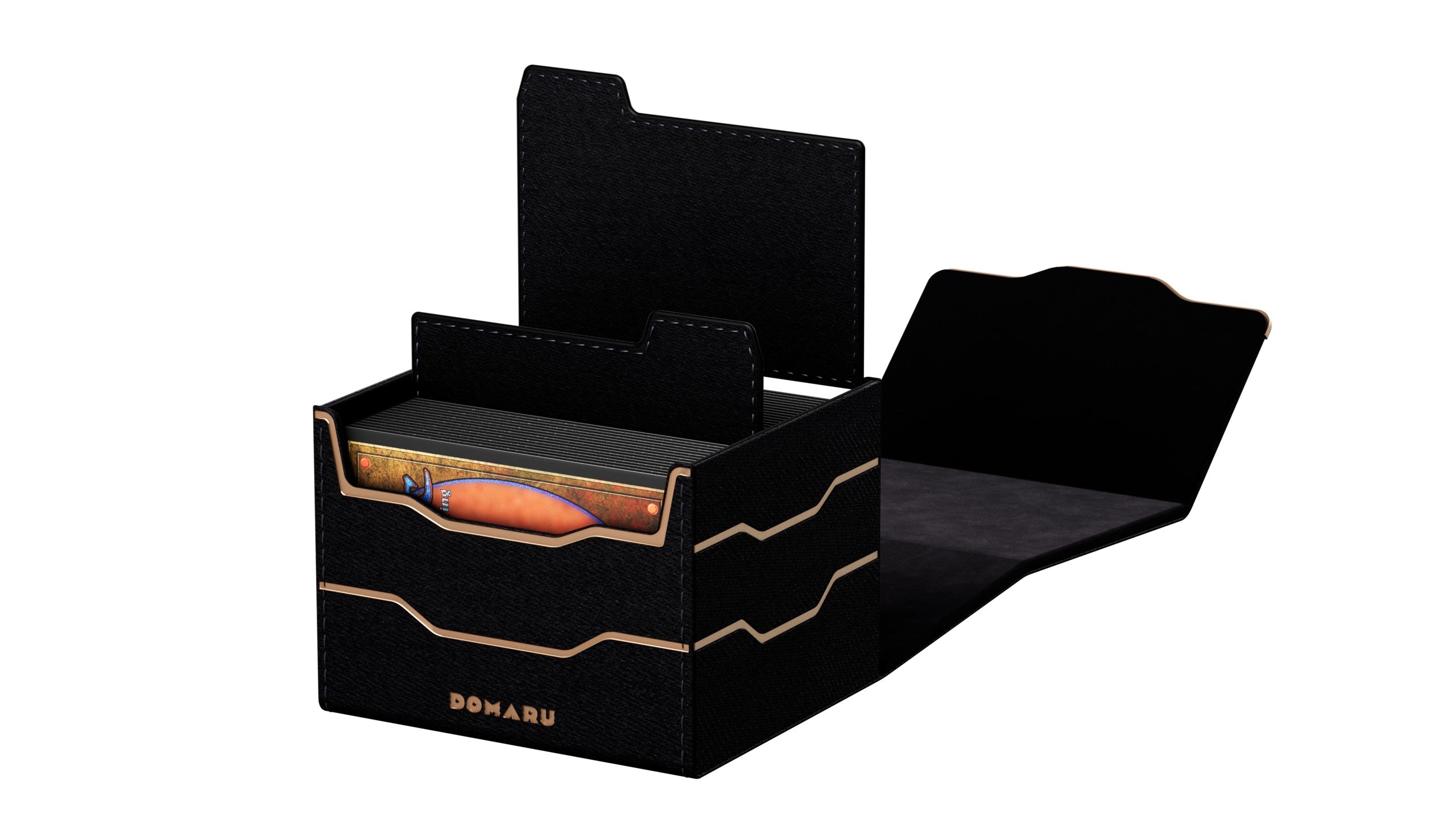 The DOMARU Armory Collection is our latest deck box line, built for strength, durability, and a commanding presence at the table. Featuring refined metallic details, a rugged textured exterior, and strong magnetic closures, each Armory box delivers uncompromising protection for serious play. Side Loading. Fits 100 double-sleeved cards. Includes 2 leather dividers. Strong Magnets. Sturdy textured leather materials and metallic details.