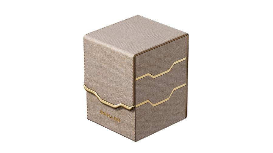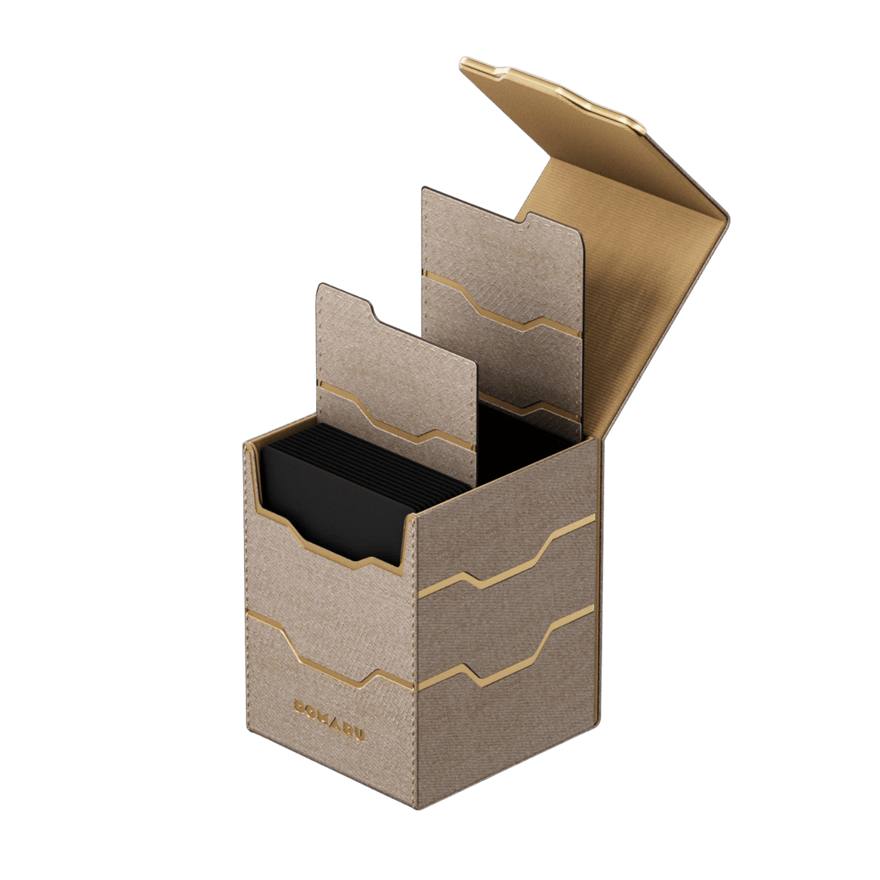 The DOMARU Armory Collection is our latest deck box line, built for strength, durability, and a commanding presence at the table. Featuring refined metallic details, a rugged textured exterior, and strong magnetic closures, each Armory box delivers uncompromising protection for serious play. Top Loading. Fits 100 double-sleeved cards. Includes 2 leather dividers. Strong Magnets. Sturdy textured leather materials and metallic details.