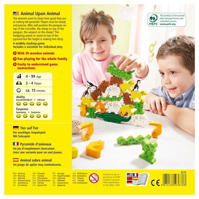 Stack up the fun with Animal Upon Animal from HABA! One of HABA's most popular games, this game is a winner of the Major Fun! Award and recipient of the Mr. Dad Seal of Approval. Players race each other to be the first to place all of their animals upon the animal pile before any of the other players. A roll of the die tells the players how many animals can be placed or whether they can add to the alligator base. This games fosters hand-eye coordination and fine motor skills.