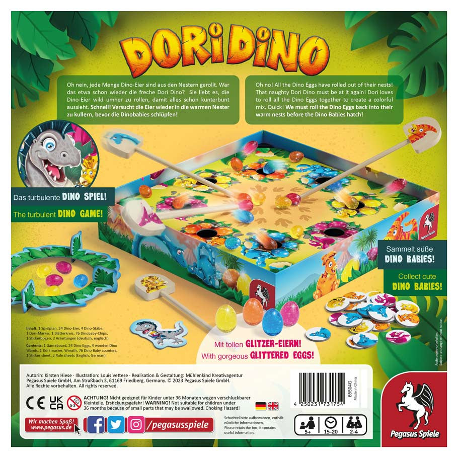 The dinos are waiting for their colorful dino eggs to hatch. Cozy and warm, the eggs lie safely in their nests. But Dori Dino loves to roll the glittering dino eggs around to create a colorful mix. Can the other players quickly roll the eggs back into their original nests before the dino babies hatch?