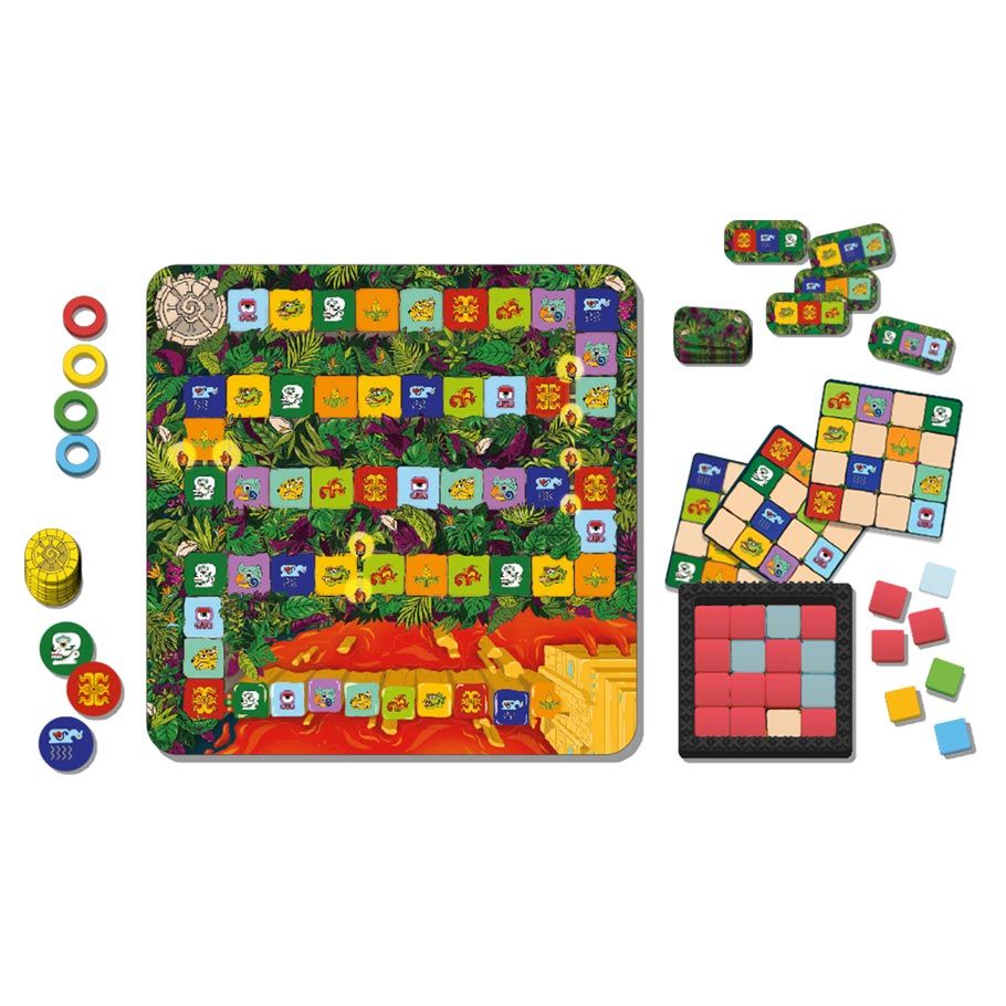 Each round, an objective card is revealed, then players slide their blocks in the grid, trying to show only the symbols shown on that card and hiding any other symbols from view. If you do this before time runs out, you can grab one of the available scoring blocks, then move your token on the scoring track to the next such symbol on the track. Thus, the quicker you solve the puzzle, the more likely you are to grab a block that advances you the farthest.