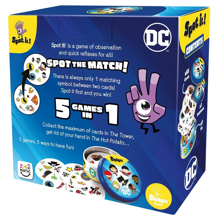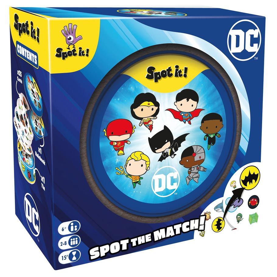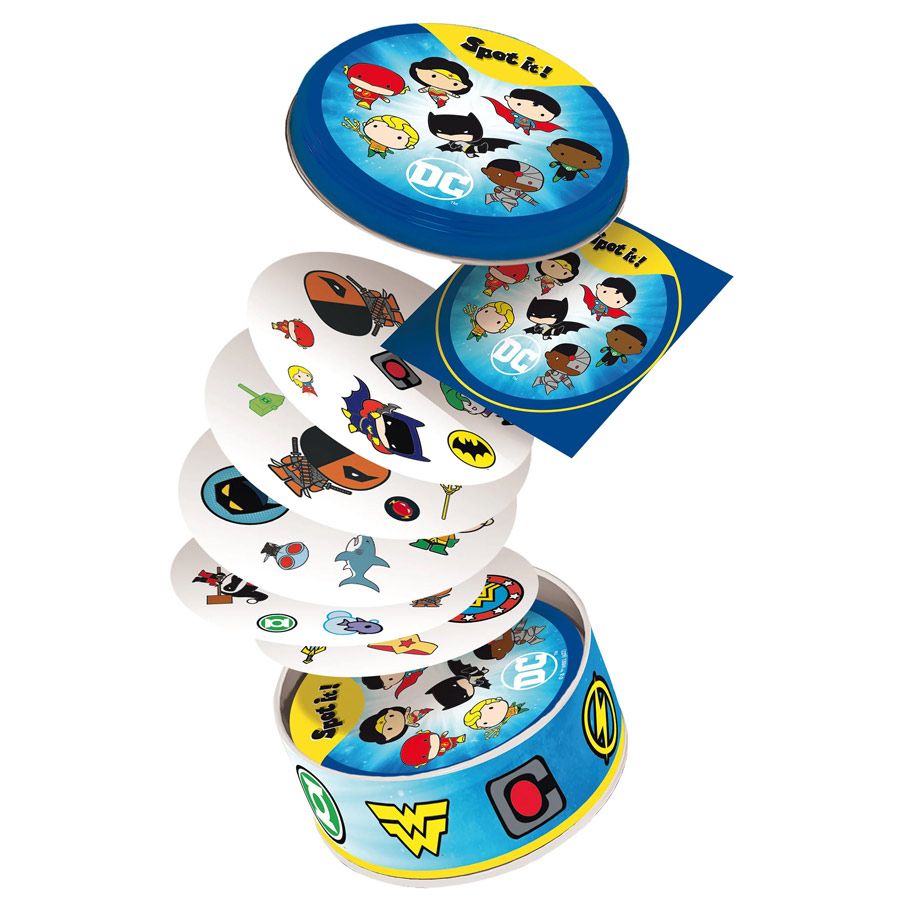 With Spot it! try to spot the unique matching symbol between every two cards in a playful battle of speedy observation. This new version of Spot It! combines emblematic characters and objects from the all the DC Universe! Featuring your favorite characters: Batman, Superman, Wonder woman and many more...