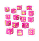 This is a set of 16 square-cornered six-sided dice for use in games of Warhammer 40,000, themed around the Death Guard. They are cast in pearlised purple acrylic plastic with green ink markings, and measure 16mm along each edge. The 1-5 facings are traditionally pipped and each '6' face is decorated with the blessed icon of the Death Guard.