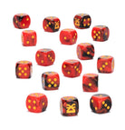 This is a set of 16 six-sided dice with rounded edges for use in games of Warhammer Age of Sigmar, themed around the Blades of Khorne. They are cast in red and black swirled acrylic plastic with metallic brass ink markings, and measure 16mm along each edge. The 1-5 facings are traditionally pipped and each '6' face is decorated with the blood-spilling icon of the Blades of Khorne.