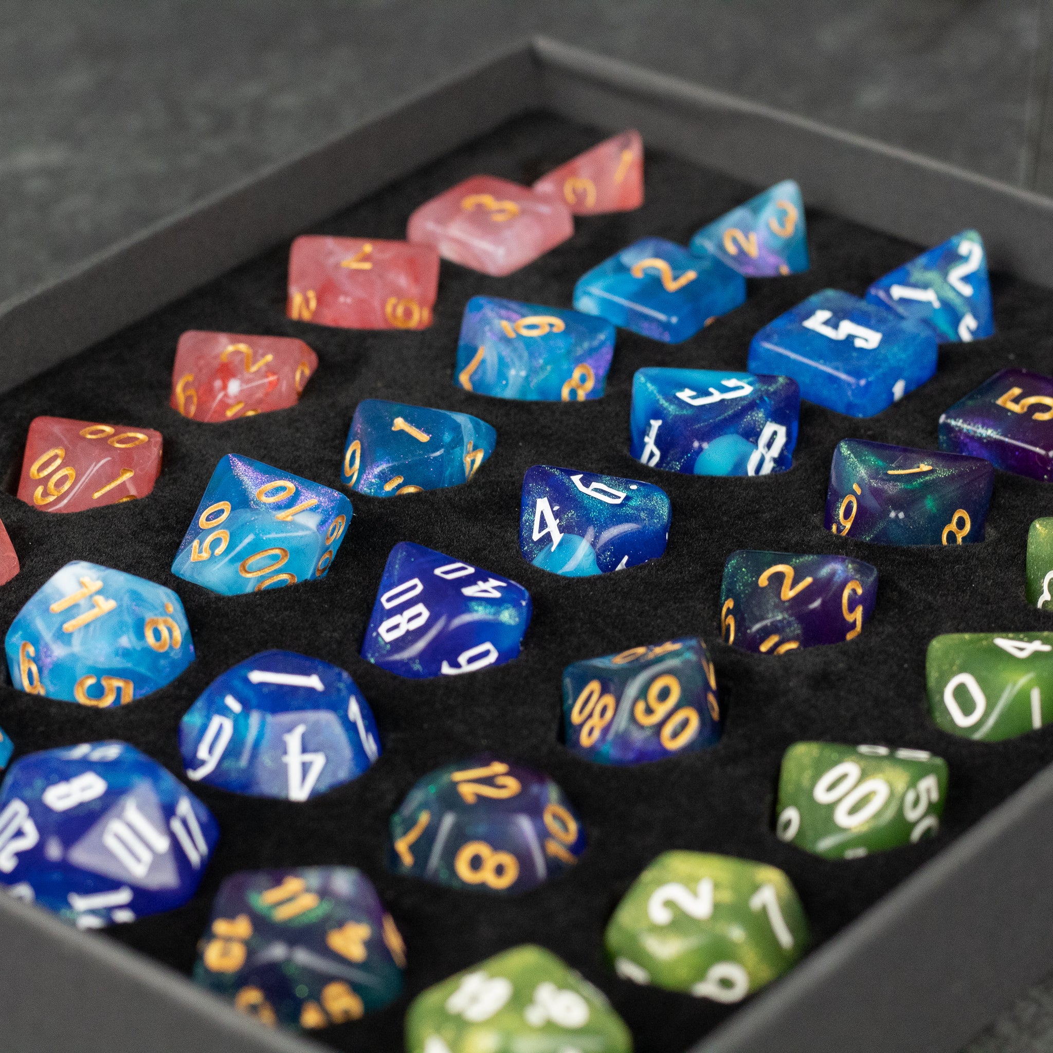 This DnD Dice Gift Box includes 5 RANDOM sets of acrylic RPG dice. Your order will be different from the picture, which is just for illustration!