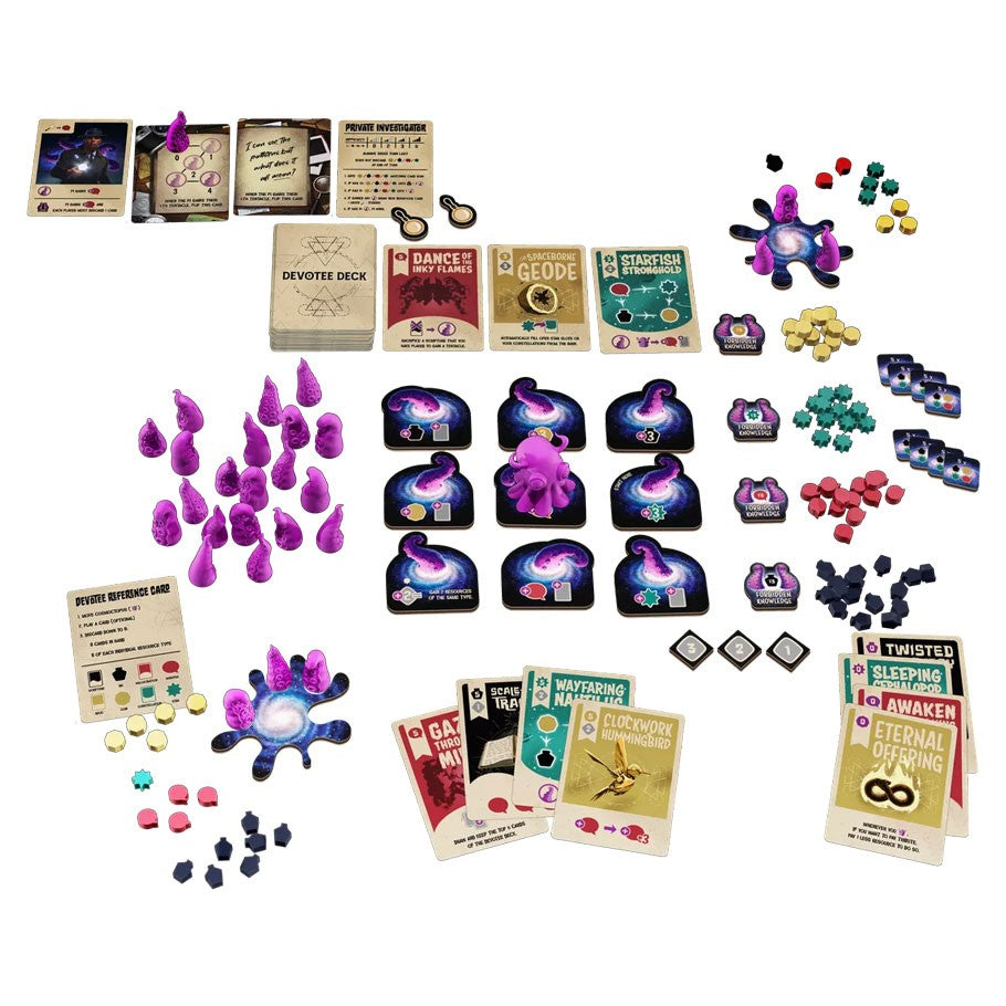 Cosmoctopus is an engine-building, tentacle-gathering board game for 1 to 4 devotees. Guide Cosmoctopus through the Inky Realm, a flexible configuration of tiles, to gather resources and obtain powerful cards that represent relics, scripture, hallucinations and constellations. Harness the power of these bizarre objects and experiences, craft potent card combinations and be the first to gain 8 tentacles to win!