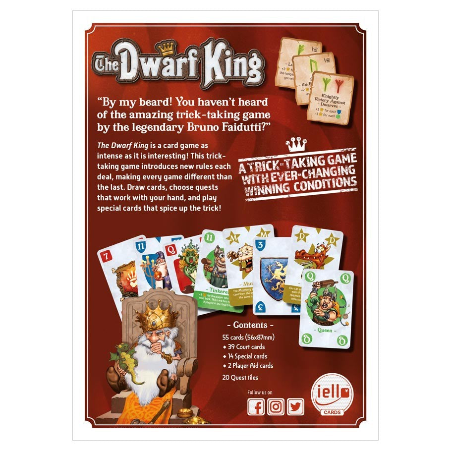The Dwarf King is a card game as intense as it is engaging! This trick-taking game introduces new rules each deal, making every game different. Take your cards, choose the quests that work with your hand, and watch out for special cards that will spice things up!
