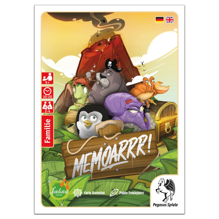 To play the match-and-memory game Memoarrr!, 2 to 4 players need the power of recollection and the luck of pirates. Only then can they make their escape from the island of Captain Goldfish, their pockets lined with rubies, before the lava swallows them up.