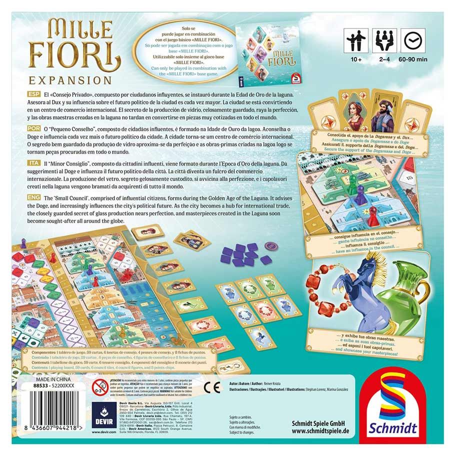 Recruit the help of the authorities, gain influence through their advice, and exhibit your masterpieces! This expansion to Mille Fiori adds a new board to the game and new ways to earn points, earning influence with the Doge, and together, adorning master works. Perfect the art of glassmaking and create the most coveted pieces in the world!