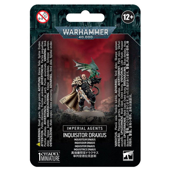 This multipart plastic kit builds Lord Inquisitor Kyria Draxus, a high-ranking Agent of the Imperium from the Ordo Xenos. Armed with a power fist and her Aeldari shuriken weapon, Dirgesinger, she is well equipped to deal death at almost any distance. Draxus is also accompanied into battle by her Wyvach familiar, Shang, through which she can channel her psychic energies.