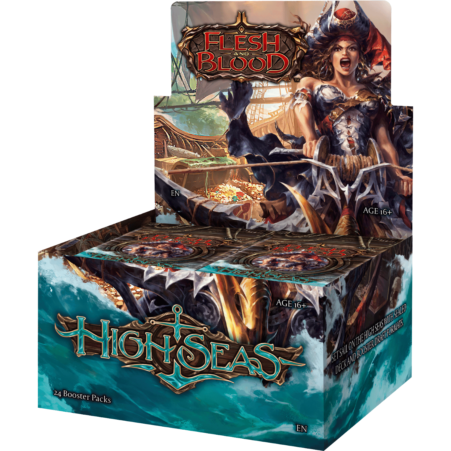 Set sail for the High Seas in search of ancient treasure, big game sea monsters, and the adventure of a lifetime! High Seas introduces the highly anticipated Pirate and Necromancer classes to Flesh and Blood. Three new dual-class heroes will navigate Rathe's treacherous open waters, each wielding a unique swashbuckling strategy that taps into previously uncharted waters of Flesh and Blood game design! Discover breathtaking Marvels, Pirate Booty, and Lost Treasures thought to exist only in fables and folklore, in Treasure Packs, found in each display of High Seas! All hands on decks! It's time to set sail for the High Seas! High Seas is a standalone booster set featuring 265 cards.