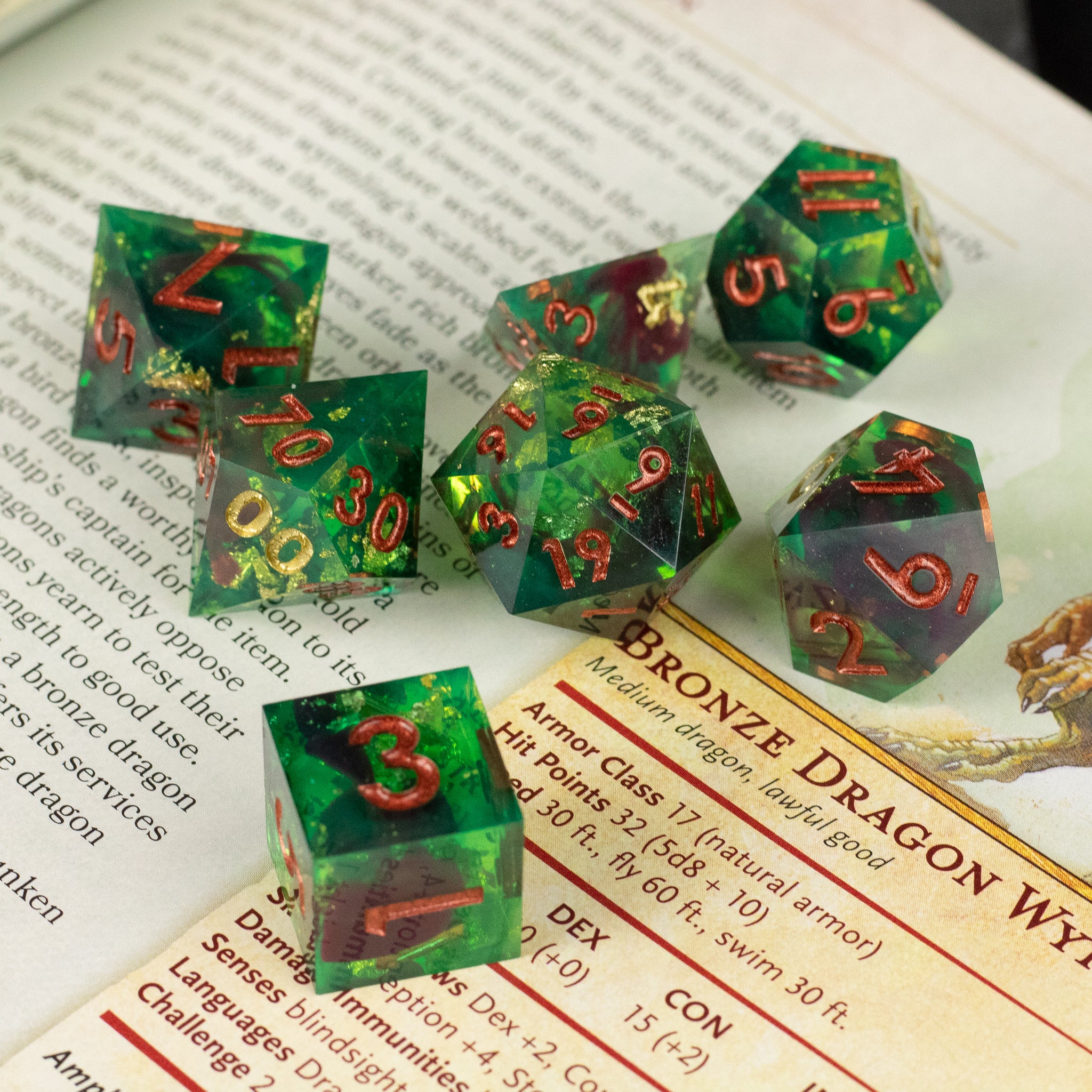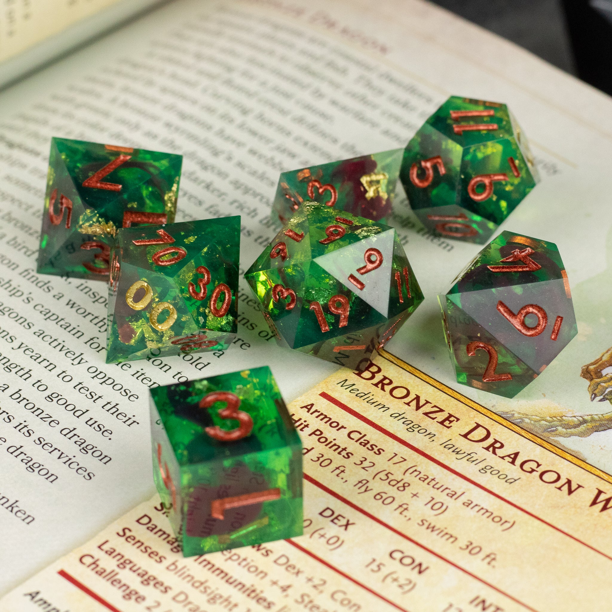 The Primal Blood DnD Dice set is a beautiful green resin dice set with gold flakes throughout and a streak of opaque red, reminiscent of a drop of blood. These polyhedral dice have sharp edges and are ideal for TTRPGs or Dungeons and Dragons.