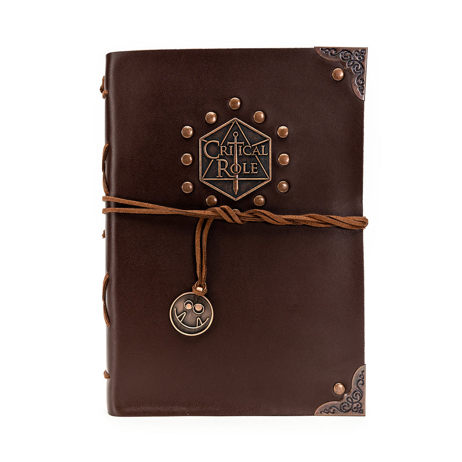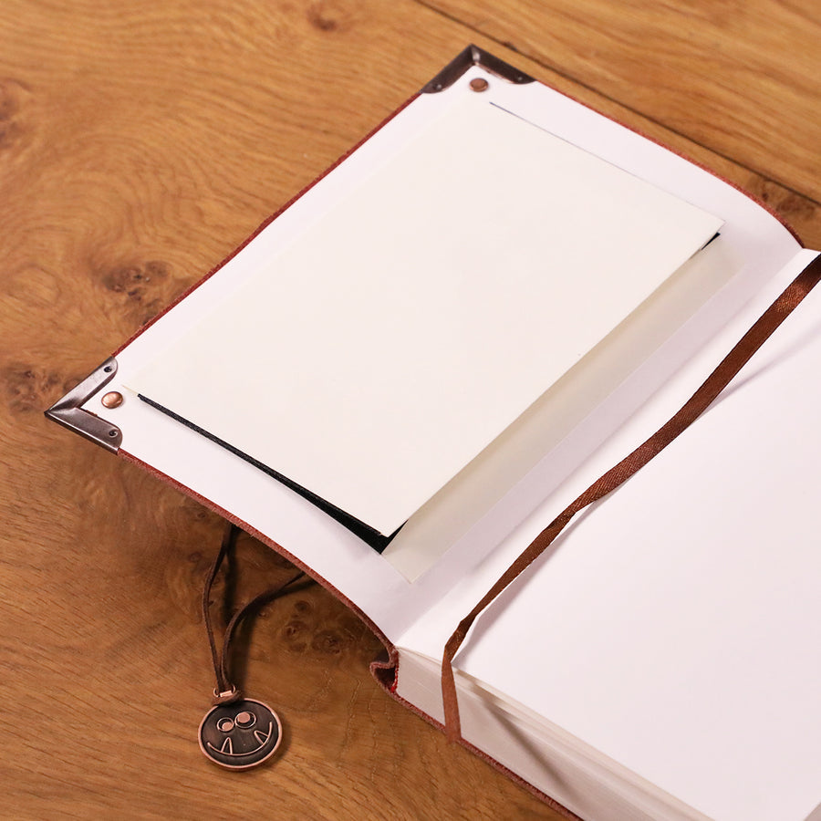 Custom copper metal Captain Tusktooth charm hangs off the leather strap that wraps around sketchbook