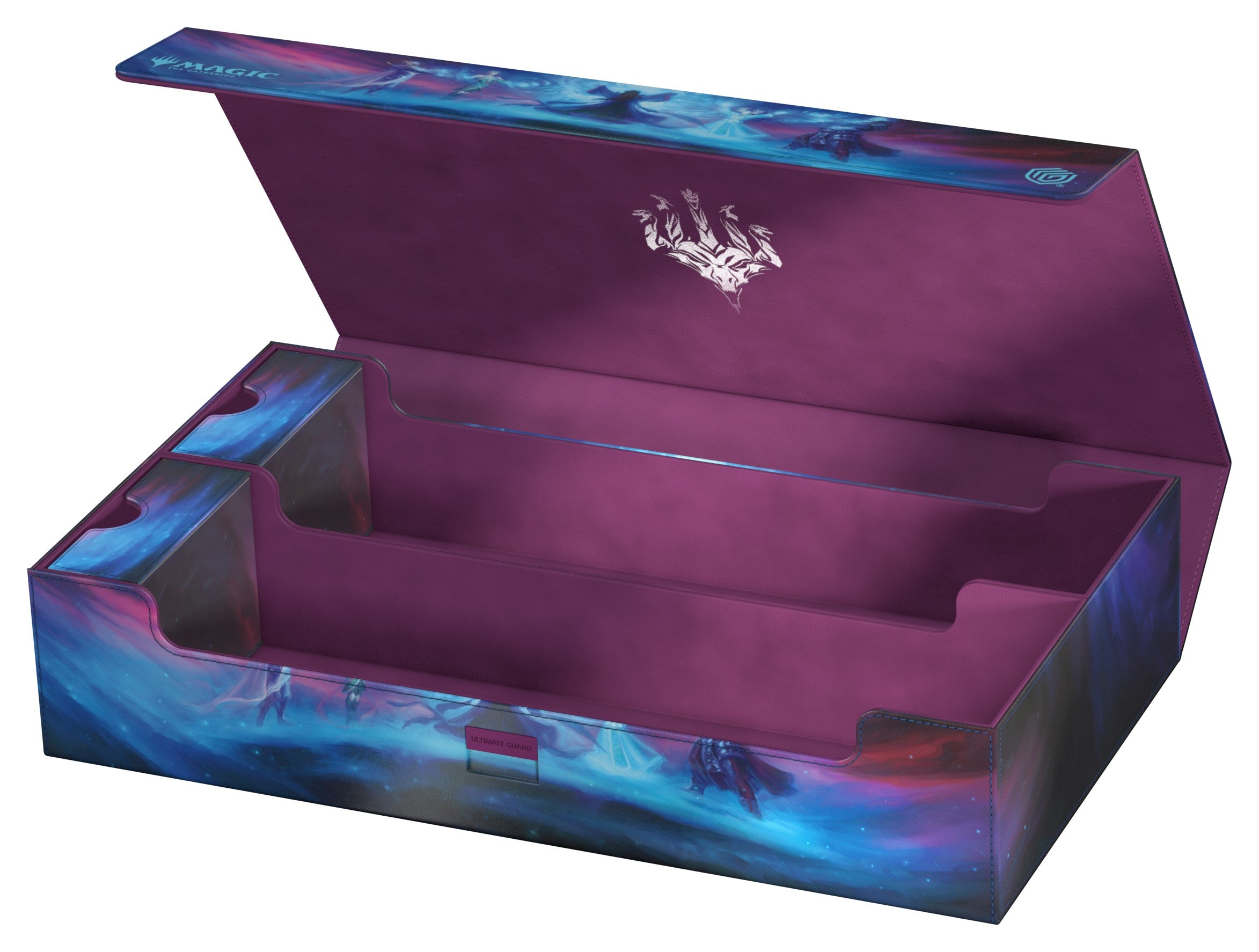 The Omnihive 1000+ Xenoskin is designed to hold multiple deck boxes, dice and/or playmats at once with the help of two flexibly positioned magnetic trays. The deck case, made of the popular and resistant Xenoskin material and printed with officially licensed art from Magic: The Gathering"s upcoming set "Duskmourn", is also the perfect choice for storing a larger collection of individual cards (up to 1000 double-sleeved). The Omnihive 1000+ Xenoskin"s inside is made of an elegant microfiber inner lining, while a strong magnetic closure with additional ZnapClaw mechanism ensures that cards and deck boxes are safe inside the box.