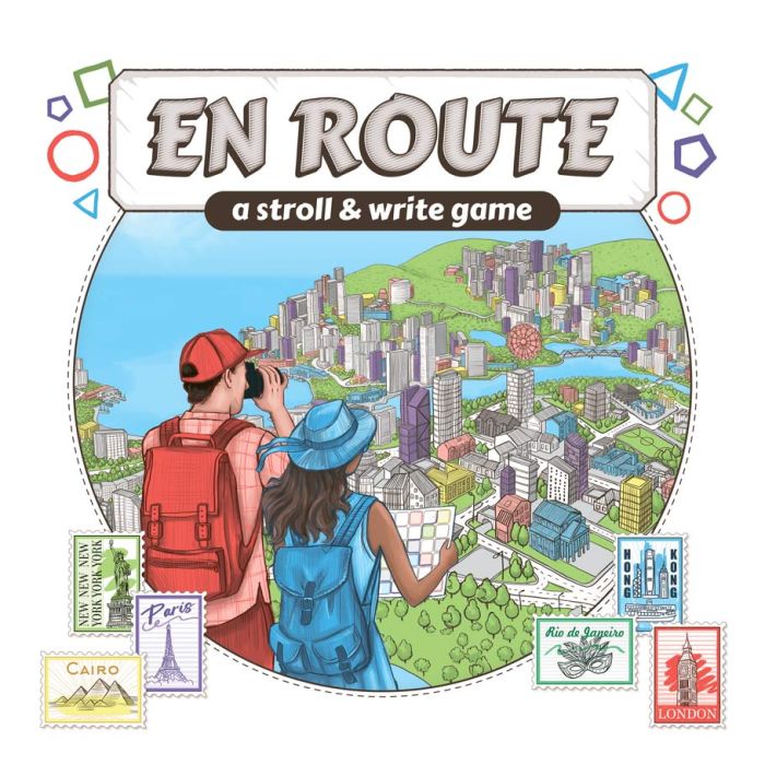 En Route is a flip-and-write game in which you create tour routes to the most interesting landmarks of the real-world cities (London, New York City, Hong Kong, Paris, Cairo, and Rio de Janeiro) and the made-up First City packed full of geek references. Every city features basic and specific mechanisms, so all of them play and feel differently.
