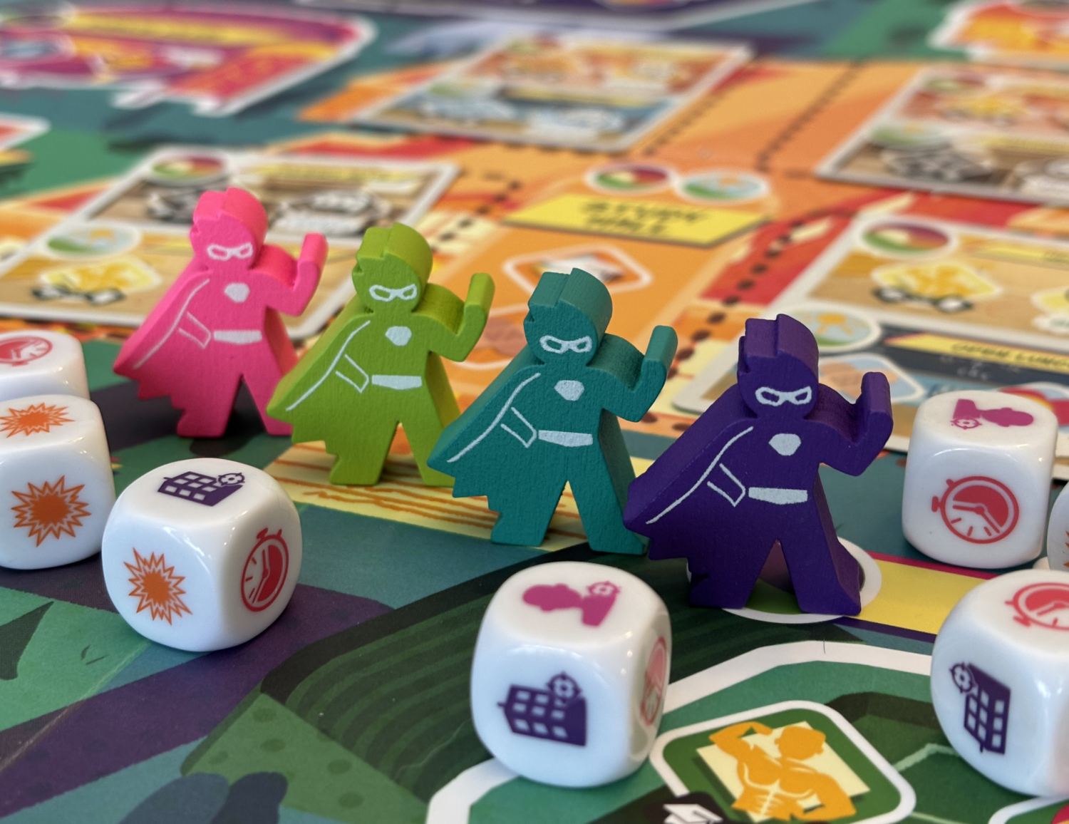 Heroic teamwork. Use powers and costumes to back each other up. Patrol to get the drop on crime or face danger head-on to protect your teammates.