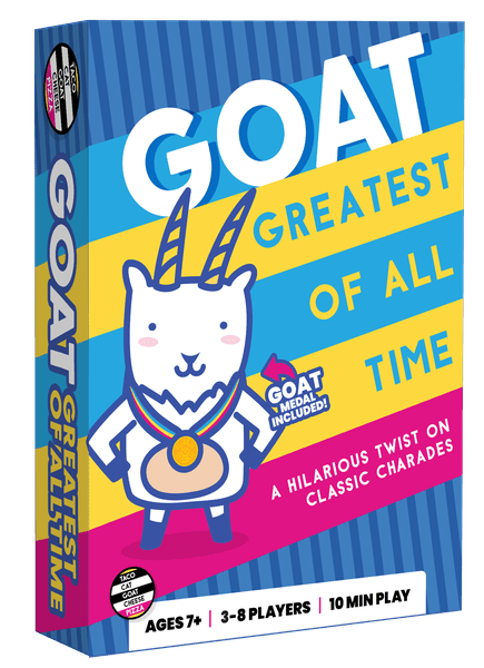 A Hilarious Twist on a Classic Favorite: GOAT (Greatest of All Time) takes the classic charades game and flips it on its head. Choose your hilarious action card and the silliest modifiers from the group. Act out the combination and put on the show of a lifetime! Points are awarded to the players whose cards were chosen, with extra points to the actor with the most memorable performance. The player with the most points at the end of the game wins and receives the GOAT medal.