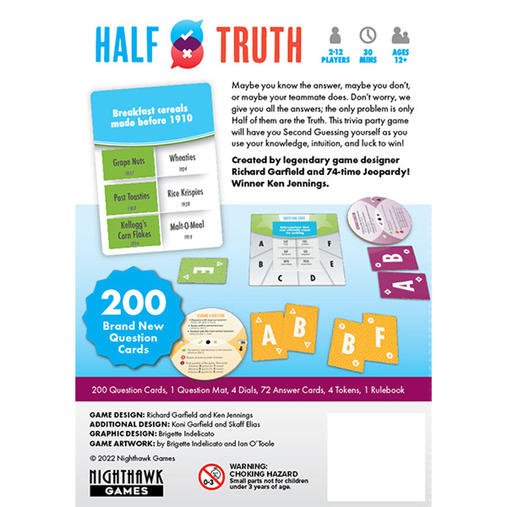 Maybe you know the answer, maybe you don’t, or maybe your teammate does. Don’t worry we give you all the answers, the only problem is only Half of them are the Truth. This trivia party game will have you Second Guessing yourself, as you use your knowledge, intuition, and luck to win! Half Truth: Second Guess is compatible with the original Half Truth.