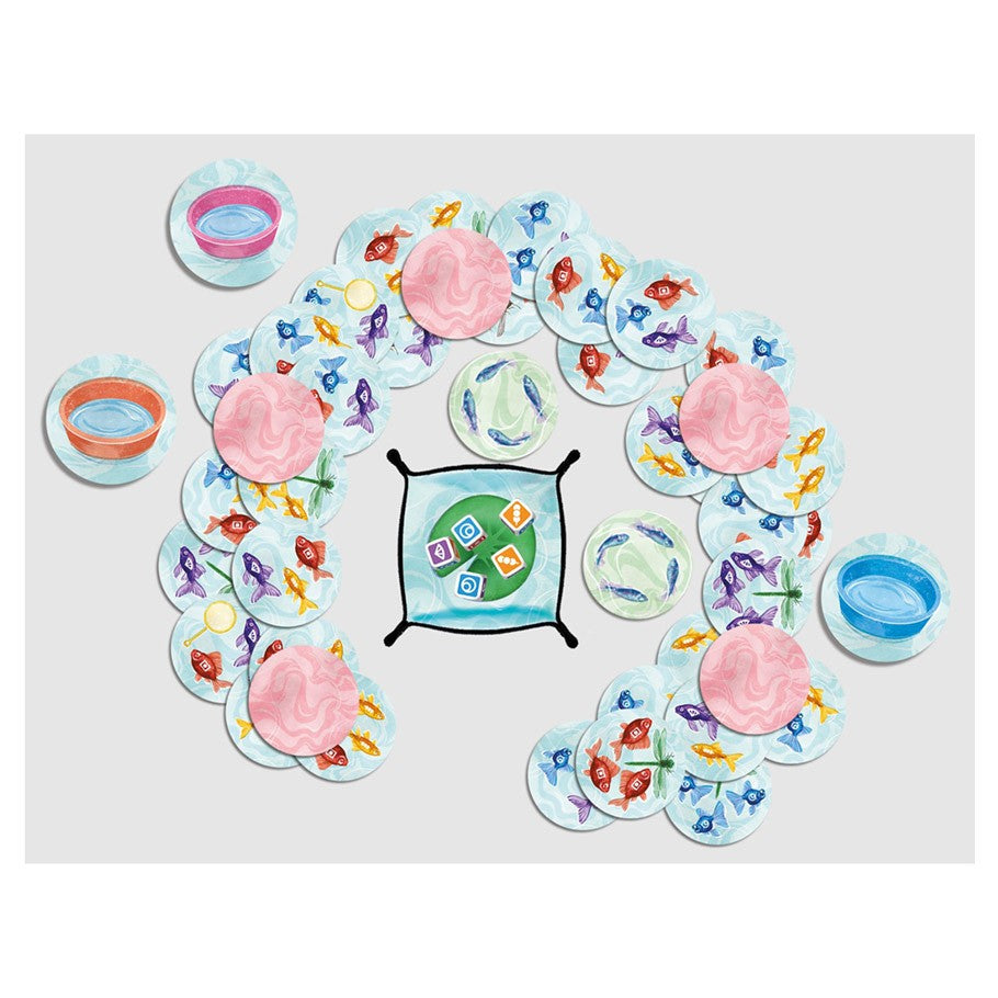 One player rolls the 5 dice, then all players simultaneously try to catch the cards with Kingyo that match the colors of the dice, announcing the colors of the Kingyo caught.