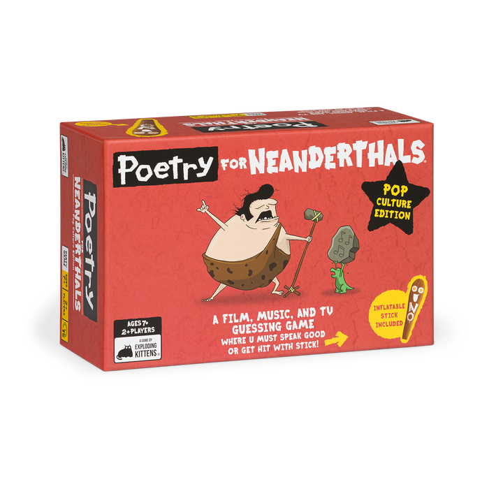 Similar to Taboo ®, the goal is to get your teammates to guess a word or phrase related to film, music, and TV. But the silly stoneage twist is, you can only use single-syllable words. If you use more than one syllable you’ll get bopped with a 2-foot inflatable club! It’s challenging but infinitely replayable.