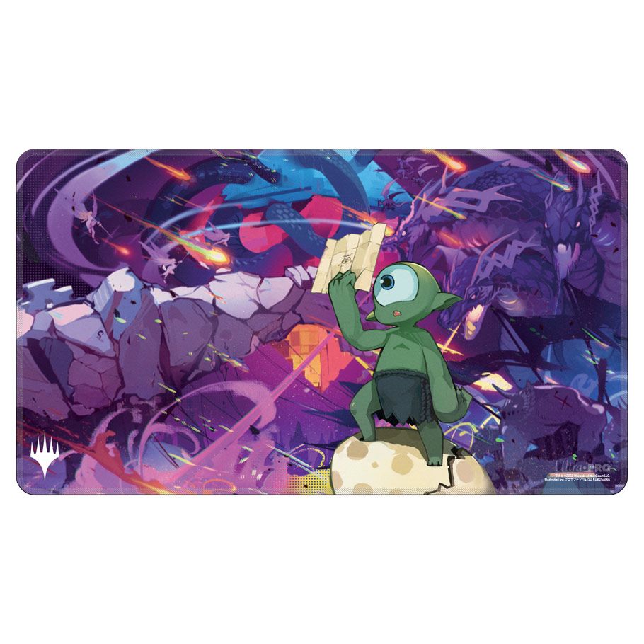Holofoil Playmats featuring popular Magic: The Gathering artwork printed on a shimmering material with stitched edges. Made with a soft fabric top to reduce damage to cards during play and a non-slip rubber backing to keep the playmat from shifting during use, playmats enhance the gameplay experience. With dimensions of approximately 24 in. x 13.5 in., a playmat also makes an excellent oversize mousepad for home or office.
