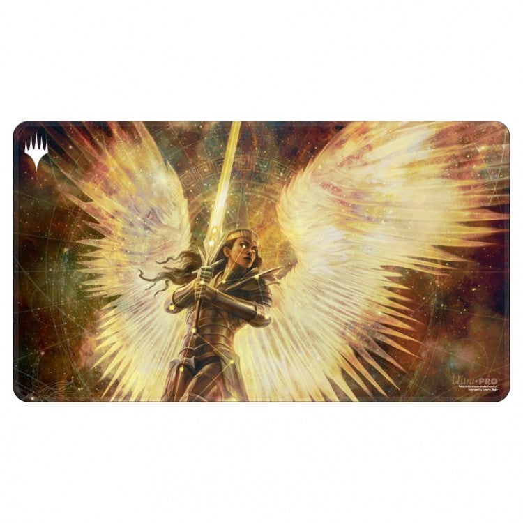 White Stitched Playmats featuring popular Magic: The Gathering artwork. Made with a soft fabric top to reduce damage to cards during play and a non-slip rubber backing to keep the playmat from shifting during use, playmats enhance the gameplay experience. The stitched edges offer an added premium feel. With dimensions of approximately 24 in. x 13.5 in., a playmat also makes an excellent oversize mousepad for home or office.