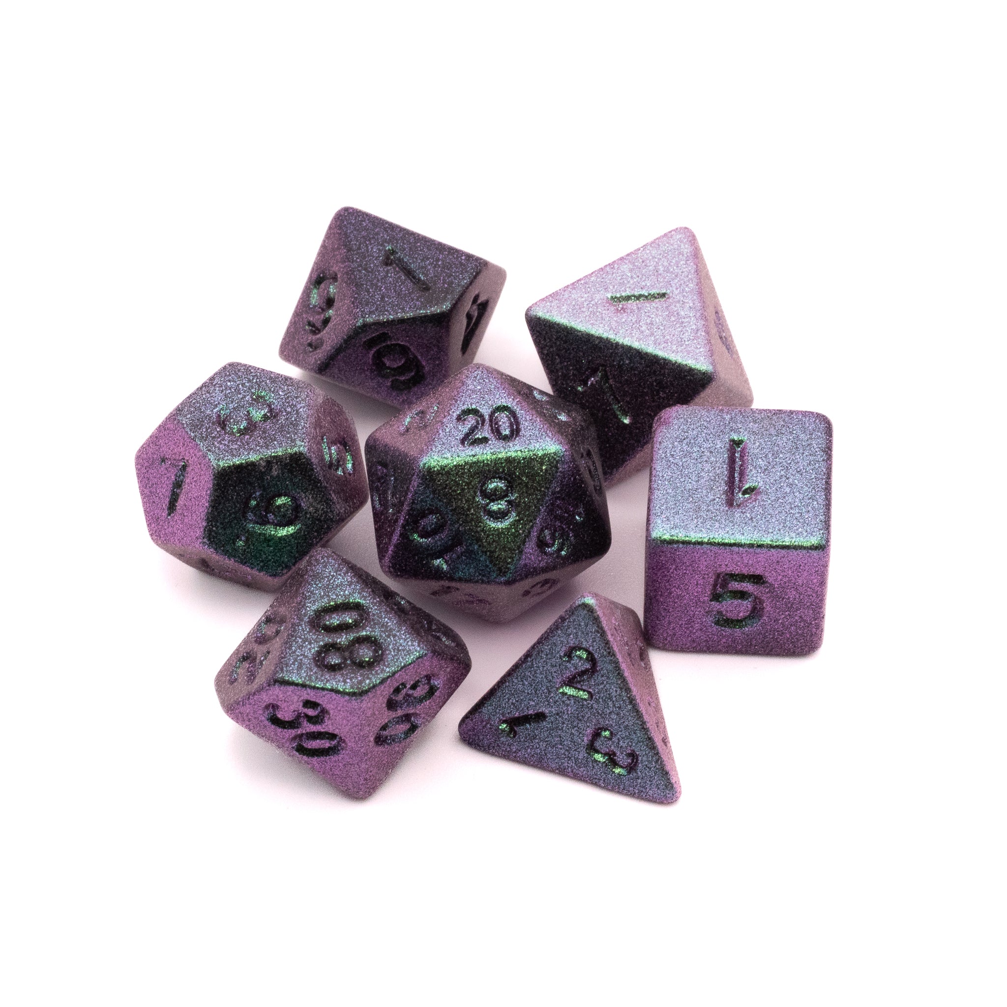 Step into a realm of enchantment with the Mystic Mirage Dice Set! This captivating collection features seven polyhedral dice, each shimmering with an otherworldly blend of deep purples and iridescent greens. The unique acrylic finish gives these dice a mystical aura, perfect for adding a touch of magic to your tabletop adventures.