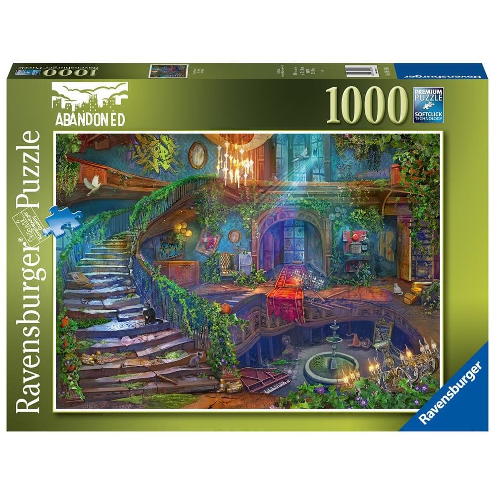 Come inside and stay awhile, there's plenty of room in our "Hotel Vacancy" puzzle! Watch your step - this once elegant establishment is now a decrepit dump! The lobby may have been the lap of luxury years ago, but now it's tagged with graffiti and littered with cans. Climb the curving stairs to nowhere; the upper floor's collapsed and dumped the piano in the patio below! At least the hotel is housing some stray cats and a beautiful white dove, adding some life amid the growing jungle of plants. Part of our Abandoned Series, enjoy eerie pleasure piecing this puzzle together! This 1,000-piece jigsaw puzzle combines captivating imagery with clean-cut pieces and Ravensburger's perfect interlocking fit for a most pleasurable puzzling experience! Our puzzles are crafted with an exclusive, extra-thick cardboard backing along with our superior, linen-structured paper, so the printed image is vibrant, crisp, and glare-free. Create memorable moments with Ravensburger premium puzzles! Fun for ages 14 and up! Measures approximately 70 x 50 cm (27 x 19.5 inches) when completed.
