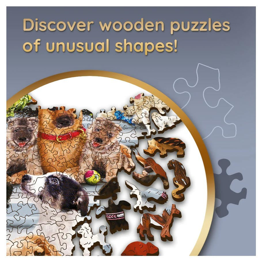 Are you a puzzle enthusiast? WOOD CRAFT wooden jigsaw puzzle by Trefl has been created just for you! Using the unique puzzle design and original puzzle figures, assemble the image and move to the doggy world. Wooden puzzles with irregular shapes are the perfect alternative to traditional puzzles with a classic form. The set consists of 1000 elements among which as many as 100 puzzle figurines in the shape of various animals have been hidden. Finding them is an additional, great fun! Find a horse, an eagle, or a rhino! Additionally, each puzzle piece has a decorative pattern on the reverse side. Appreciate the high quality of craftsmanship, notice the intensity of colors and eye-catching details. WOOD CRAFT wooden puzzles will delight aesthetes and puzzle lovers looking for a new dimension of entertainment. Train your memory and logical thinking skills and develop your creativity. You will see that it is a real hit and great entertainment for adults and children aged 12 and over. Puzzles have been manufactured from high quality materials. Out of concern for the environment, we have reduced the amount of plastic by making the packaging entirely from cardboard. An exceptional series! Wooden puzzle created for those who appreciate neat craftsmanship, aesthetics, and modern solutions. Put the picture together and meet the doggy team!