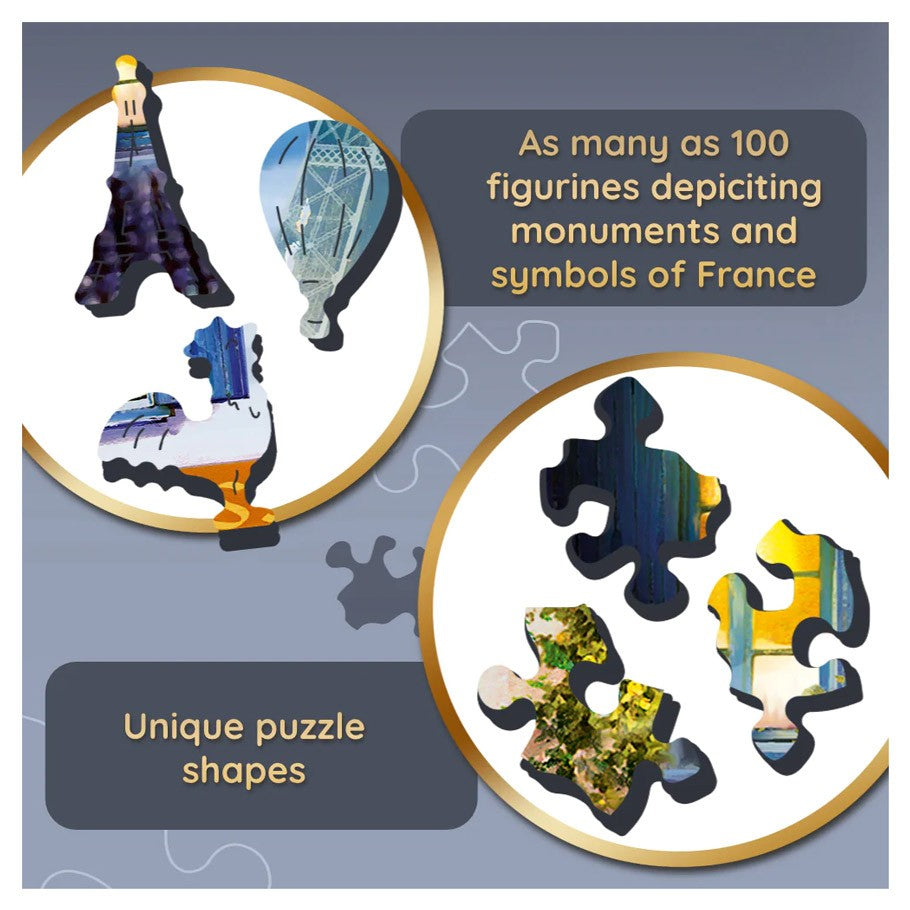 Are you a puzzle enthusiast? WOOD CRAFT wooden jigsaw puzzle by Trefl has been created just for you! Using the unique puzzle design and original puzzle figures, assemble the image and feel the atmosphere of the capital of France. Wooden puzzles with irregular shapes are the perfect alternative to traditional puzzles. The set consists of 1000 elements among which as many as 100 puzzle figurines in the shape of various French symbols and monuments have been hidden. Finding them is an additional, great fun! Find the Eiffel Tower, the Arc de Triomphe of the Gallic cockerel! Additionally, each puzzle piece has a decorative pattern on the reverse side. Appreciate the high quality of craftsmanship, notice the intensity of colors and eye-catching details. WOOD CRAFT wooden puzzles will delight aesthetes and puzzle lovers looking for a new dimension of entertainment. Train your memory and logical thinking skills and develop your creativity. You will see that it is a real hit and great entertainment for adults and children aged 12 and over. Puzzles have been manufactured from high quality materials. Out of concern for the environment, we have reduced the amount of plastic by making the packaging entirely from cardboard.* An exceptional series! Wooden puzzle created for those who appreciate neat craftsmanship, aesthetics, and modern solutions. Put together a romantic picture and move to the Parisian Street!
