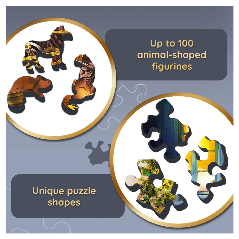 Are you a puzzle enthusiast? WOOD CRAFT wooden jigsaw puzzle by Trefl has been created just for you! Using the unique puzzle design and original puzzle figures, assemble the image and move to the mysterious chamber. Wooden puzzles with irregular shapes are the perfect alternative to traditional puzzles. The set consists of 1000 elements among which as many as 100 puzzle figurines in the shape of various animals have been hidden. Finding them is an additional, great fun! Find the seal, turtle, or chameleon! Additionally, each puzzle piece has a decorative pattern on the reverse side. Appreciate the high quality of craftsmanship, notice the intensity of colors and eye-catching details. WOOD CRAFT wooden puzzles will delight aesthetes and puzzle lovers looking for a new dimension of entertainment. Train your memory and logical thinking skills and develop your creativity. You will see that it is a real hit and great entertainment for adults and children aged 12 and over. Puzzles have been manufactured from high quality materials. Out of concern for the environment, we have reduced the amount of plastic by making the packaging entirely from cardboard.* An exceptional series! Wooden puzzle created for those who appreciate neat craftsmanship, aesthetics, and modern solutions. Put the picture together and feel the magical atmosphere!