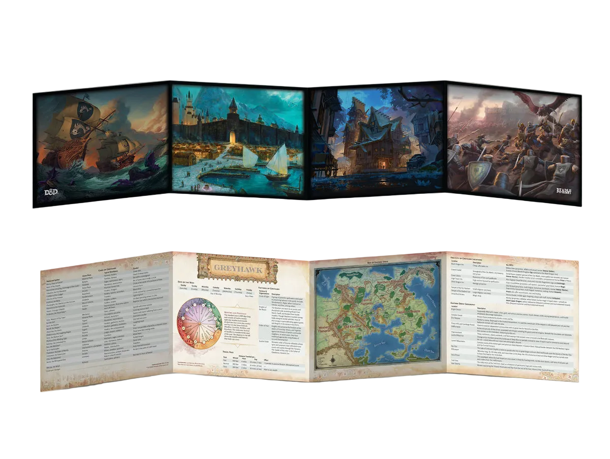 • DM screen: Greyhawk is a rich and intricate setting filled with power struggles and ever-shifting loyalties. This unique DM screen immerses the players into that world with epic art on the front while providing DM’s at-a-glance reference tables on the back. DM’s will be able to quickly rattle off Greyhawk details like the gods of the realm, the calendar, geography, and important names without missing a beat.