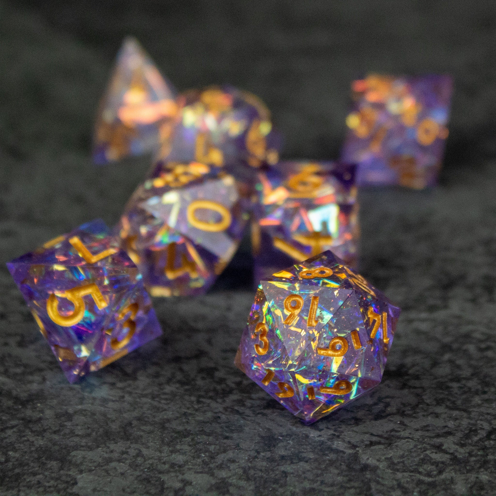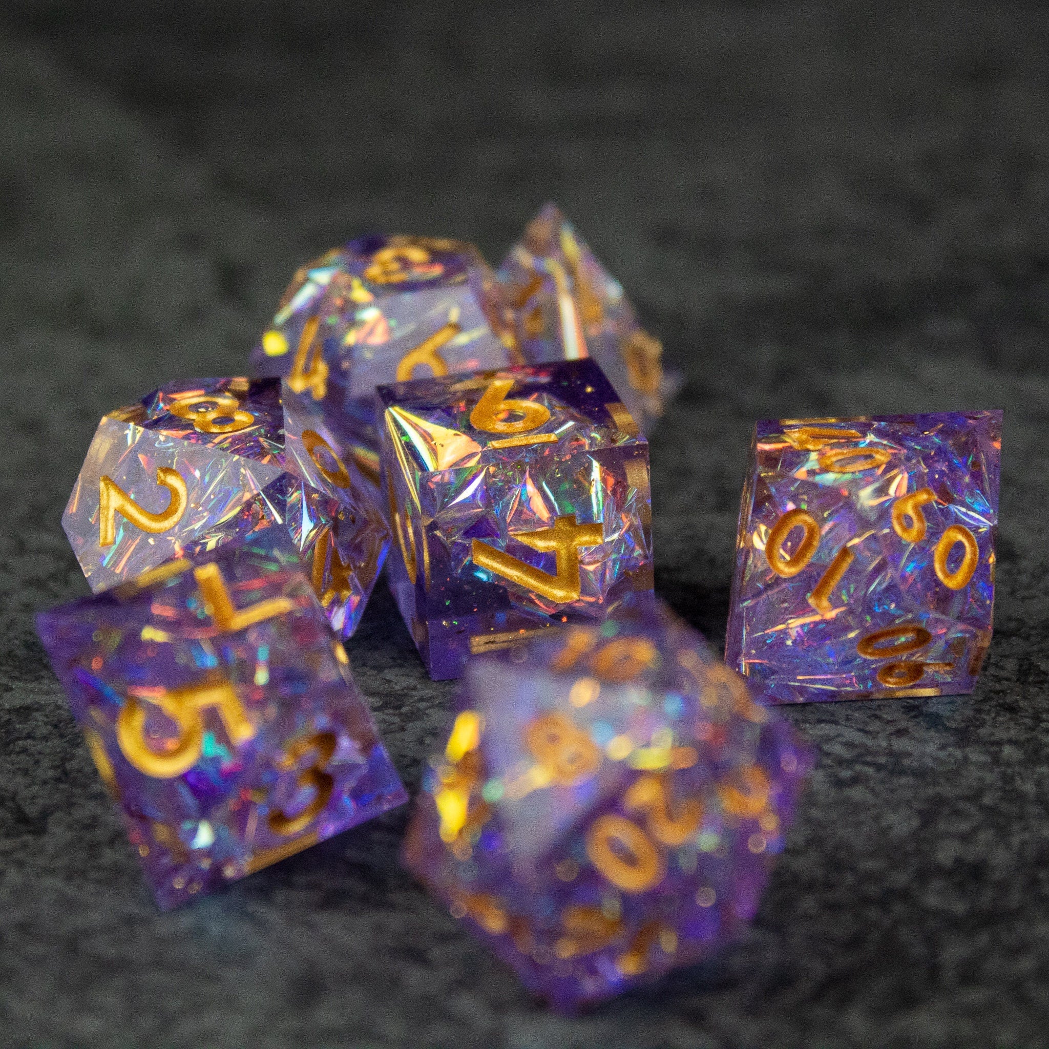 The Feywild DnD Dice Set features clear, lavender-colored resin with holofoil inclusions and subtle sparkles. Reminiscent of their namesake, they are chaotic and magical. These polyhedral dice have sharp edges and are ideal for TTRPGs like Dungeons and Dragons or Pathfinder. Perfect for any fae related characters