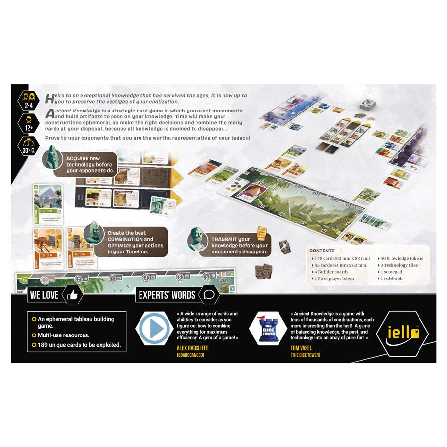 You are this world’s most ancient builders, the final heirs to an illustrious civilization. Use your knowledge to make its grandeur endure through time! Ancient Knowledge, is an ephemeral tableau building game with fleeting, intense, subtle, and provoking strategies. Optimize how your cards synergize and build amazing monuments to memorialize the glory of your civilization. Acquire the knowledge of your monuments before it is lost forever! Gain as many victory points as possible and prove yourself worthy of your famous ancestors.