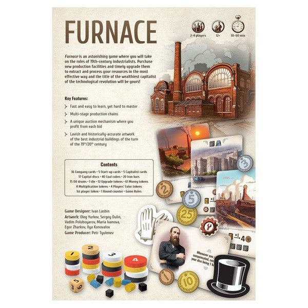 Furnace is an engine-building Eurogame in which players take on the roles of 19th-century capitalists building their industrial corporations and aspiring to make as much money as they can by purchasing companies, extracting resources, and processing them in the best combinations possible.