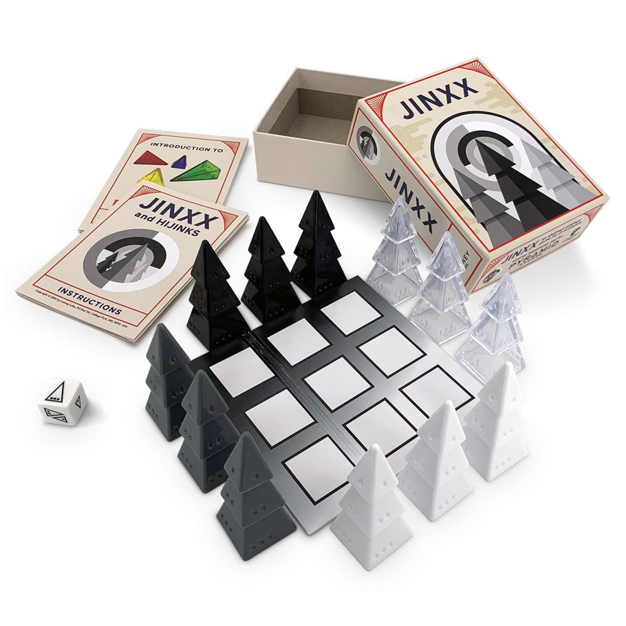 Jinxx is an abstract strategy game for 2-4 players featuring striking stacking pyramid-shaped pieces in three sizes and four colors--black, white, gray, and clear. In Jinxx, players jockey for position on a 3x3 grid. Pyramid size and a die roll determine your possible moves on each turn. Use your move to capture an opponent's piece or better position one of your own pieces. If you own the topmost pyramids in any three-space line through the center, you win! But be careful — you can also be eliminated if you lose too many of your pieces!